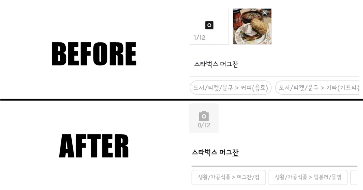 하지만 추천 결과가 부정확한 경우에도, 사용자는 상품을 등록할 카테고리를 일일이 찾기 번거롭기 때문에 이 부정확하게 추천된 카테고리를 그대로 사용하는 경우가 많았습니다. 예를 들어, 기존 알고리즘은 ‘나이키 농구화’를 등록하려는 사용자에게 기타(남성화) 카테고리를 추천해줬고, 그 결과 이 사용자는 농구 의류/잡화 카테고리가 별도로 있음에도 불구하고 이 상품을 기타(남성화) 카테고리에 등록하는 사례가 있었습니다. 이에 따라, 카테고리를 기준으로 상품을 탐색하는 사용자는 '상품이 왜 이렇게 뒤죽박죽이지'라는 인상을 갖게 되기 쉬웠습니다.