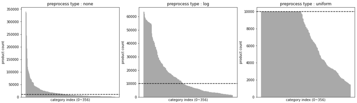 상한 설정 방법에 따라 카테고리별 학습 데이터 상품 수 분포는 아래와 같이 표현되는 것을 확인했습니다. 스케일 비교를 시각적으로 보조하기 위해 10,000을 의미하는 까만 점선을 플랏에 각각 추가했습니다.