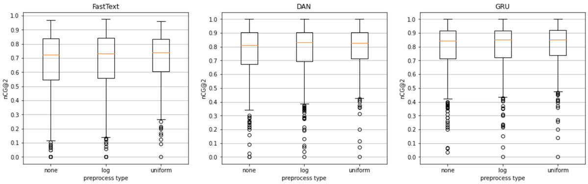 세 모델에서 모두 uniform 방식을 사용해 수집한 데이터로 학습시킨 모델의 Precision@2 중앙값이 다른 전략을 사용했을 때보다 높거나 같지만, 1분위수와 4분위수 사이의 간격(박스의 세로 길이)은 항상 uniform 방식을 사용했을 때가 작았습니다. 이를 통해 여러 카테고리에서 보다 균등하게 좋은 추천을 제공하는 데이터 수집 방법은 uniform이라는 것을 알 수 있습니다.