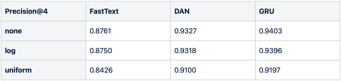none이나 log방식으로 획득한 데이터에는 인기 카테고리에 등록되는 상품의 개수가 많습니다. 그래서 사전 크기를 정해놓고 토크나이저를 학습시키면 비인기 카테고리에서 사용되는 단어보다는 인기 카테고리에서 사용되는 단어가 더 많이 등록됩니다. 이에 따라 상대적으로 비인기인 카테고리에 대한 정확도를 희생해서 인기 카테고리에 대한 정확도를 개선시키게 됩니다. 전체 상품을 대상으로 계산한 Precision@2, Precision@4도 단순히 상품이 더 많은 인기 카테고리의 상품들을 더 많이 맞추다 보니 none, log에서 더 좋아진 것으로 이해할 수 있습니다.