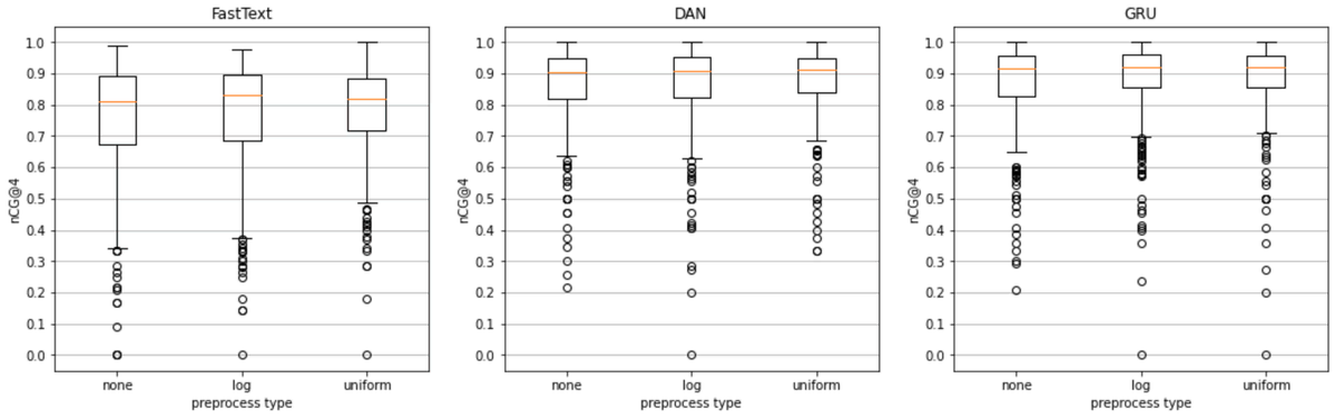 여기서도 수집되는 상품 데이터 수가 더 많은 none이나 log 방식이 uniform 방식보다 우수해 보이지만, 카테고리별로 계산한 Precision@4의 박스플랏에서는 uniform 방식으로 수집한 데이터로 훈련시킨 모델이 여러 카테고리에서 균등하게 좋은 추천을 제공하고 있는 것을 확인할 수 있습니다.