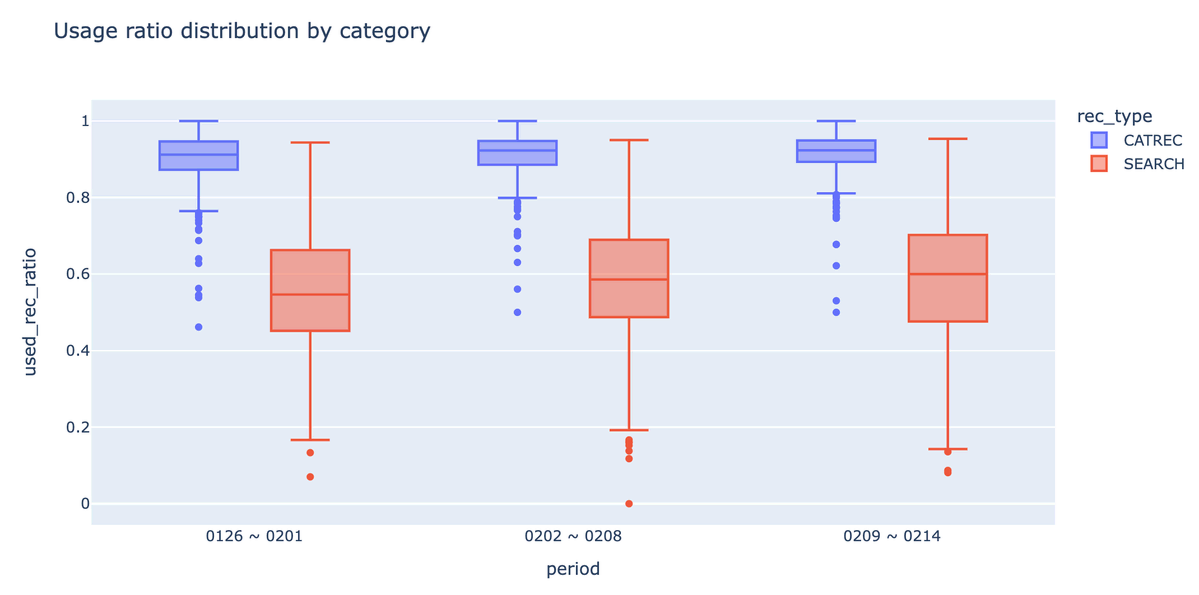 또한, 추천 대상이 된 카테고리 각각에 해당하는 추천 알고리즘 사용률을 주 단위로 집계하고, 이 비율들의 분포를 박스플랏으로 나타냈습니다. 실험 단계에서 확인한 것과 같이, 기존 알고리즘(SEARCH)에 비해 신규 알고리즘(CATREC)이 다양한 카테고리를 정확하게 추천해 주고 있음을 확인할 수 있었습니다.