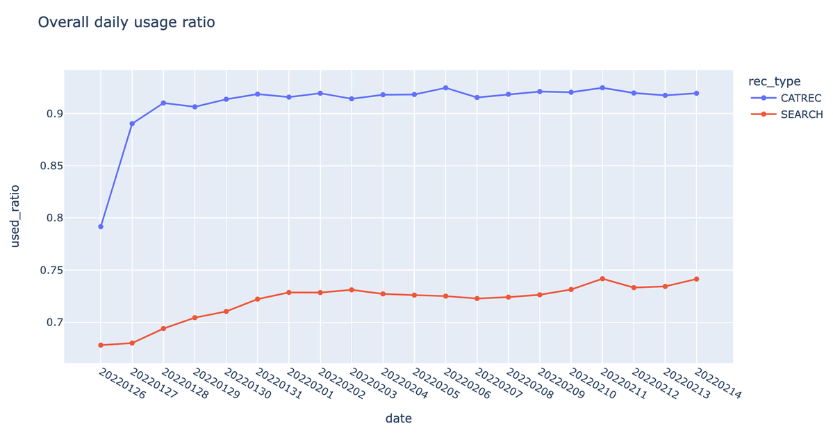 위와 같은 결정 사항들을 반영해서 알고리즘을 구현했고, 이 알고리즘은 내부 검토를 거쳐 2022년 1월 26일에 일반 사용자들에게 배포되었습니다. 버전 업데이트 등을 통해 이 기능을 사용하게 된 사용자와 아닌 사용자들이 섞여 있는 기간(2022-01-26 ~ 2022-02-14)동안 수집된 로그를 사용해서, 기존 알고리즘과 신규 알고리즘의 사용률을 실제 사용자들을 대상으로 측정해서 비교했습니다.