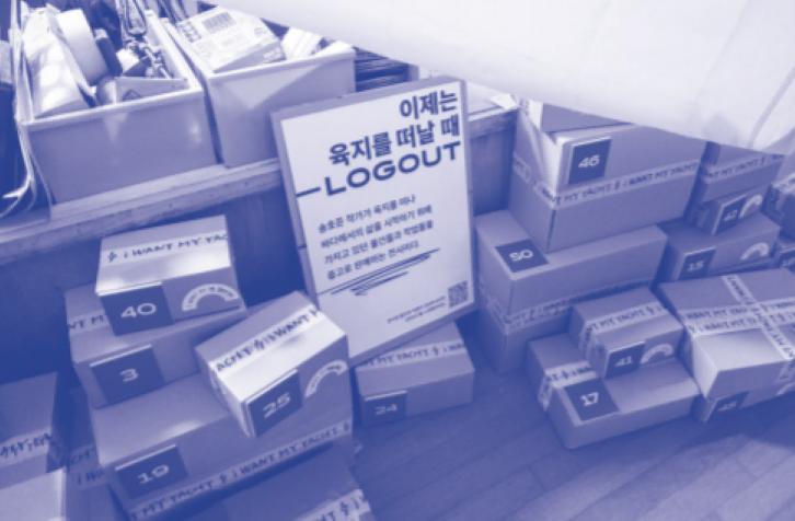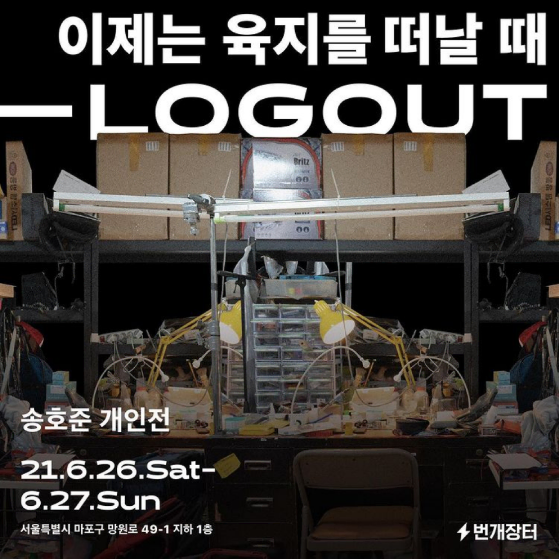 번개장터는 다사다난했던 번개장터 선원들의 여정을 기록하면서 아직 팔리지 않은 물건을 정리하는 방법이 가장 ‘송호준스러운’ 작업이 되기를 바랐습니다. 그렇게 열린 송호준 작가의 개인 전시회! 육지를 떠나 바다에서의 삶을 시작하는 선언이 시작됐습니다. 이름하여, <이제는 육지를 떠날 때 - LOGOUT>