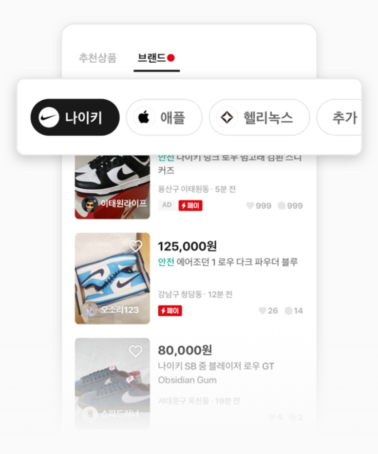 소비가 곧 취향인 시대에, 브랜드는 그 자체로 자신의 취향과 가치관을 표현하는 수단이 될 뿐 아니라 상품성이 검증되었다는 점에서 더욱 매력적인 중고거래 아이템입니다. 이번 개편에서도 중고거래 시장에서 브랜드 제품 거래의 성장 잠재력을 높게 평가했다는 점이 배경이 되었어요. 기존 번개장터의 거래, 검색 데이터를 기반으로 이용자가 가장 많이 찾는 인기 브랜드 900개에 대한 브랜드 팔로우 기능을 도입했고, 해당 브랜드의 상품을 보다 정확하게 분류하기 위해 하루 9만 건 이상 업로드되는 상품을 분석해 브랜드 단위로 상품을 자동 분류하고 있습니다. 이를 통해 번개장터가 지향하는 ‘취향 거래 플랫폼’으로서의 입지를 더욱 공고히 할 수 있을 것으로 기대합니다.