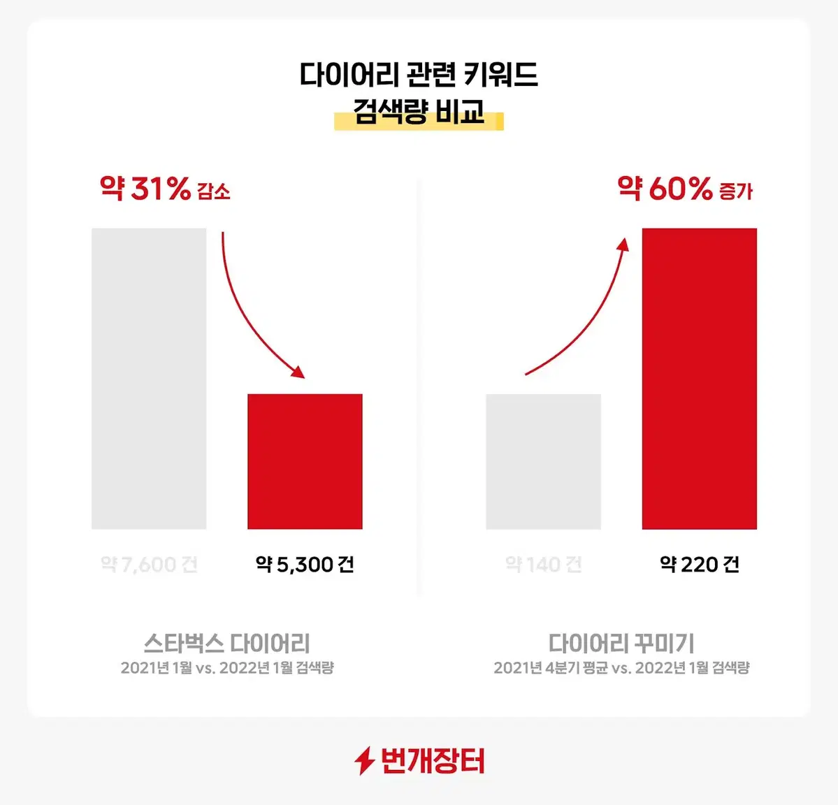 매년 크리스마스만 되면 화제였던 스타벅스 다이어리 대란이 무려 13년 만에 품절 사태에서 벗어났다고 해요. 실제로 스타벅스 다이어리는 번개장터에서도 2021년 1월 7,600여 번씩 검색됐던 데 반해, 2022년 1월에는 5,300여 번으로 작년과 비교해 검색량이 약 31%나 감소했죠📉