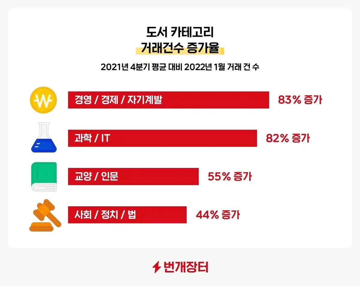 거래 건수 기준, 과학/IT, 교양/인문, 사회/정치/법 카테고리가 그 뒤를 이었습니다. 과학/IT는 지난해 4분기 평균 대비 82% 증가, 교양/인문과 사회/정치/법은 각각 55%, 44% 늘었습니다.