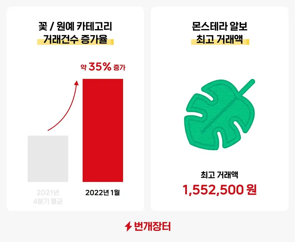 번개장터에서 꽃/원예 거래 건수는 지난해 4분기 평균 대비 약 35%나 증가했어요. 거래액 증가율은 거래 건수 증가율보다 3배 가량 큰 약 104%를 기록했는데요. 최근에는 ‘식(植)테크’가 하나의 트렌드로 자리 잡으면서 반려 식물을 키워 중고거래 앱에 판매하는 모습도 포착! 특히 잎에 흰색 무늬가 들어간 ‘몬스테라 알보’는 최고가 155만 2천 5백 원에 거래되기도 했고 이파리 하나에 최소 70만 원에서 많게는 100만 원 중반대를 형성하고 있어요😲.