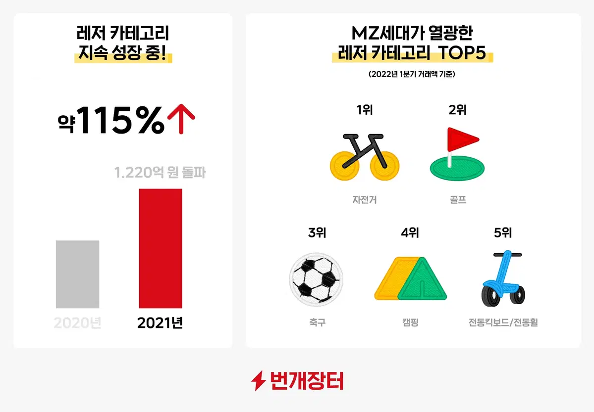 번개장터의 스포츠·레저 카테고리의 2021년 연간 거래액은 1,220억 원으로 전년 대비 115% 증가한 것으로 나타났습니다! 코로나19 유행 이후 비교적 안전한 레저활동을 즐기는 사람들이 늘어나면서 취향 중고거래 앱 번개장터에서 취미 활동을 위한 용품을 찾는 사람들도 늘고 있는데요.
