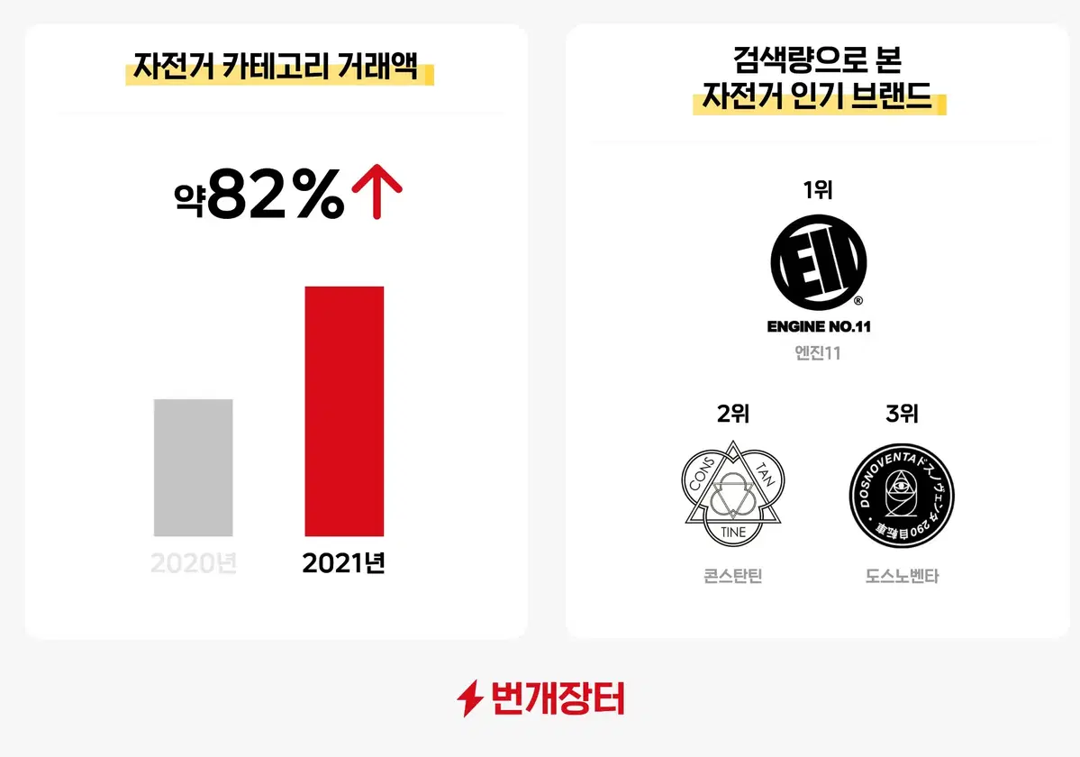 자전거는 꾸준한 인기를 얻고 있는 레저 카테고리 중 하나죠! MZ세대를 중심으로 건강관리도 즐겁게 하자는 ‘헬시플레저’ 문화가 확산되는 가운데 내 건강 뿐 아니라 지구의 건강도 지킬 수 있는 자전거가 주목 받고 있는데요. 번개장터에서도 2021년 거래액이 전년 대비 82% 증가하며 꾸준한 인기 상승세를 보이고 있습니다.