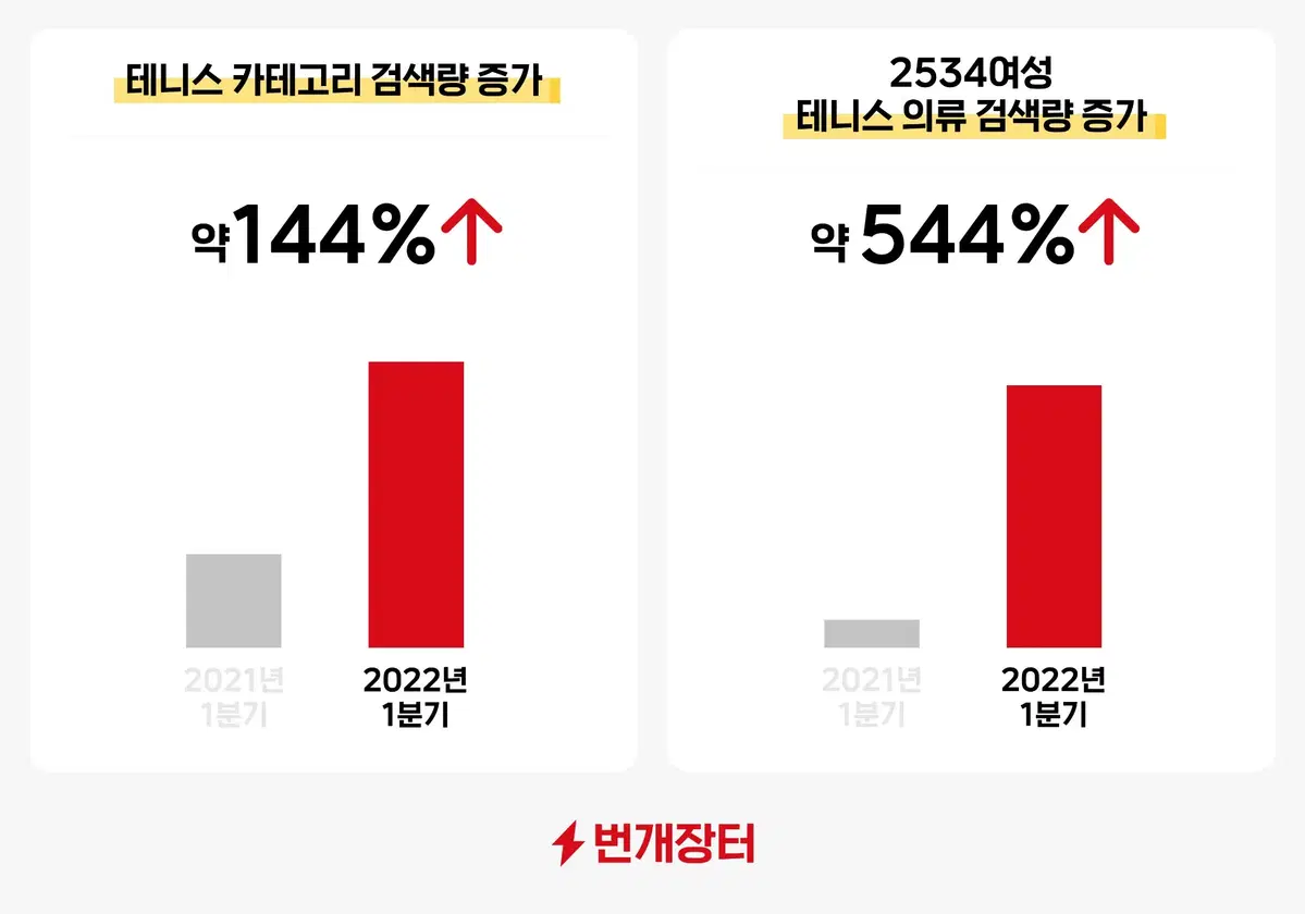 테니스칠 때도 스타일은 놓칠 수 없죠. 테니스 특유의 럭셔리한 이미지를 강조하면서도 코트 밖에서 일상복으로 입을 수 있는 실용성을 놓치지 않은 제품들이 잇따라 출시되고 있습니다! 번개장터의 올해 1분기 테니스 의류 관련 검색량은 작년대비 214% 증가했고, 특히 25세 이상 34세 여성 의류 검색량이 544% 증가했어요.