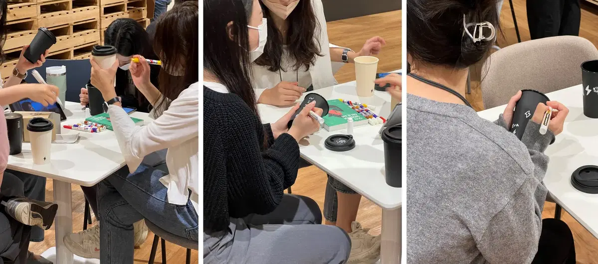 또한 자신의 번개 컵에 그림을 그리며, 각자 개성에 따라 유니크한 리유저블 컵으로 커스터마이징 하는 즐거운 시간도 함께 가졌어요.