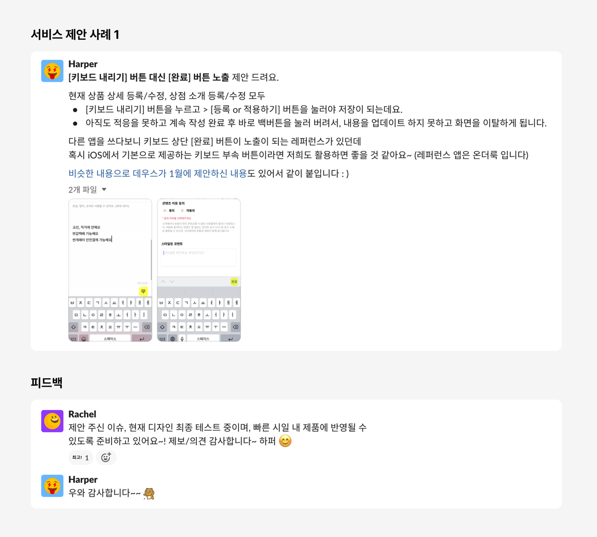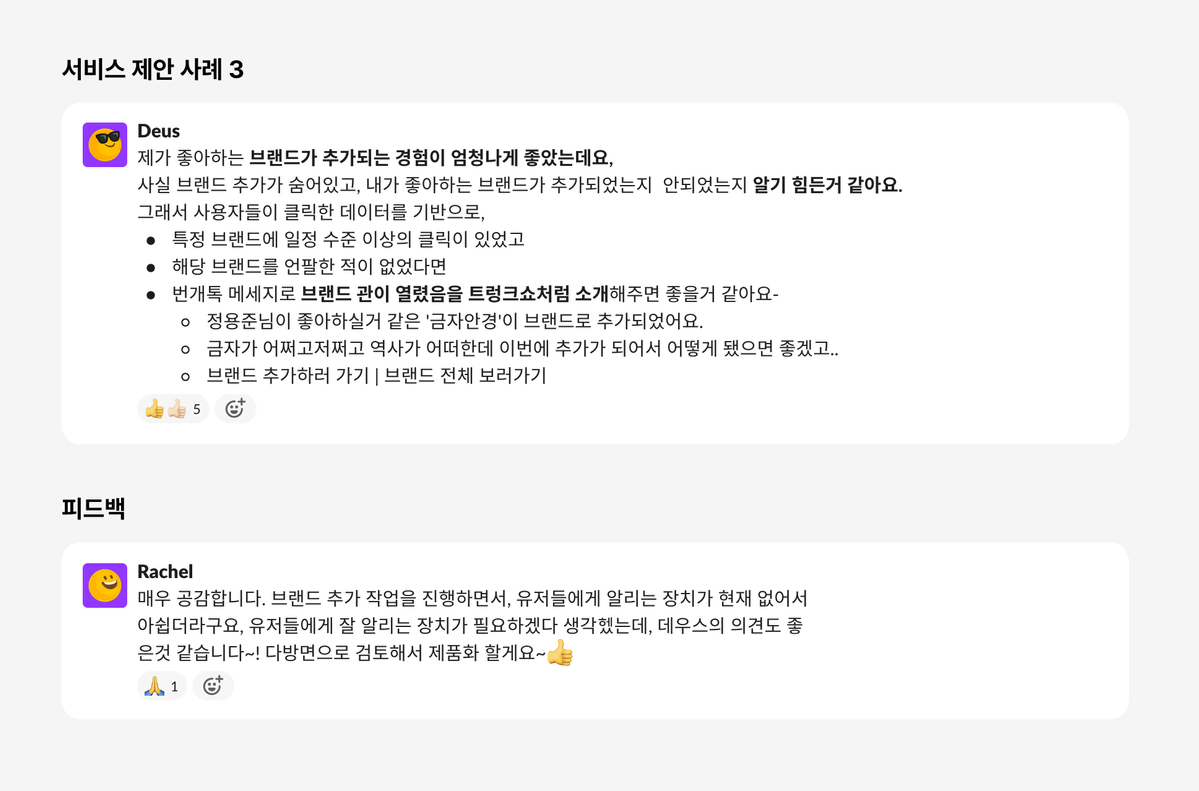 더 좋은 서비스를 만들기 위해 <#서비스-제안> 채널에서 누구나 좋은 의견을 제안할 수 있고, 좋은 의견이 모여 공감대가 형성되면 실제로 서비스에 반영되기도 해요. 오픈된 커뮤니케이션으로 구성원 모두가 번개장터 서비스를 함께 만들어 가고 있어요