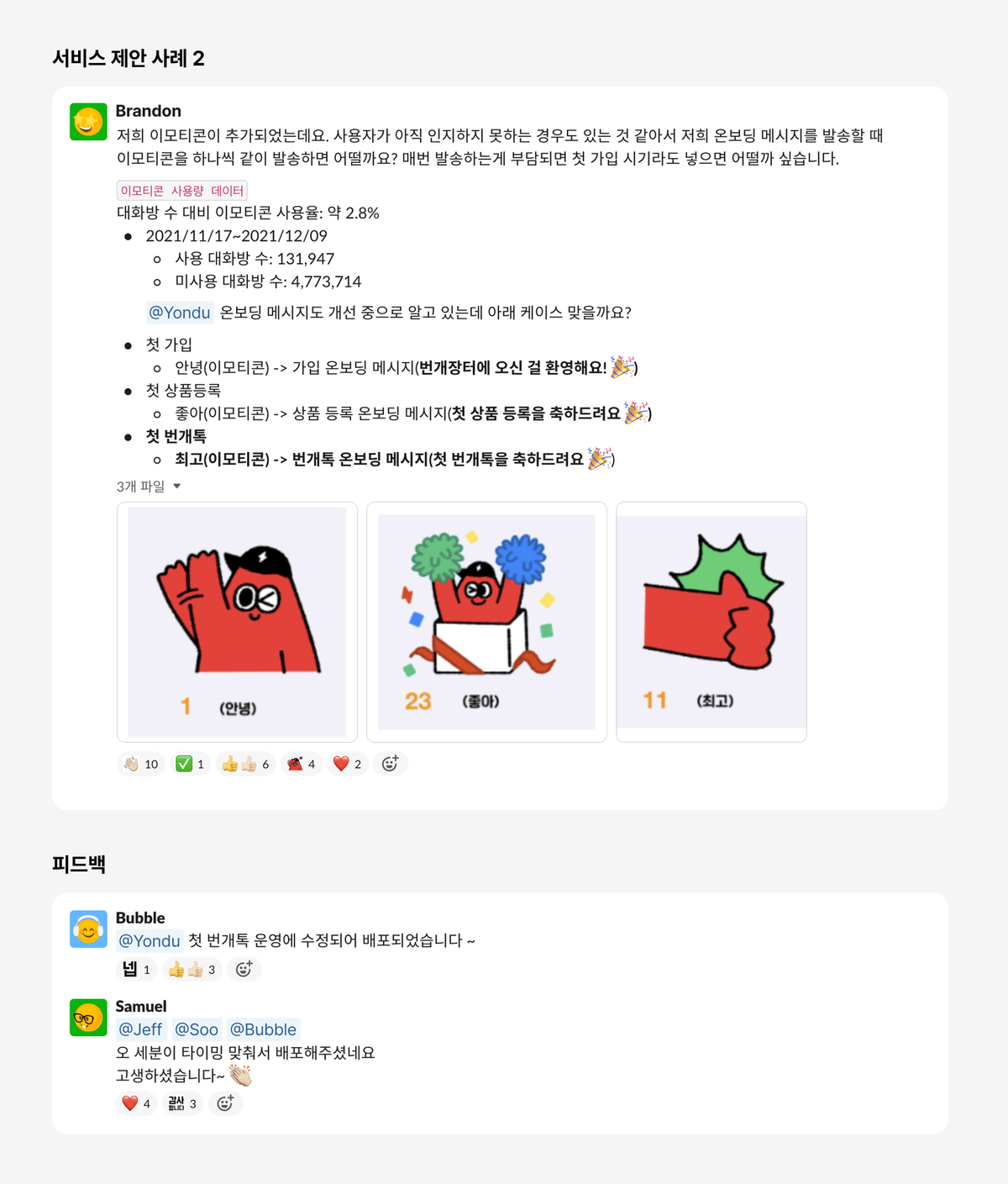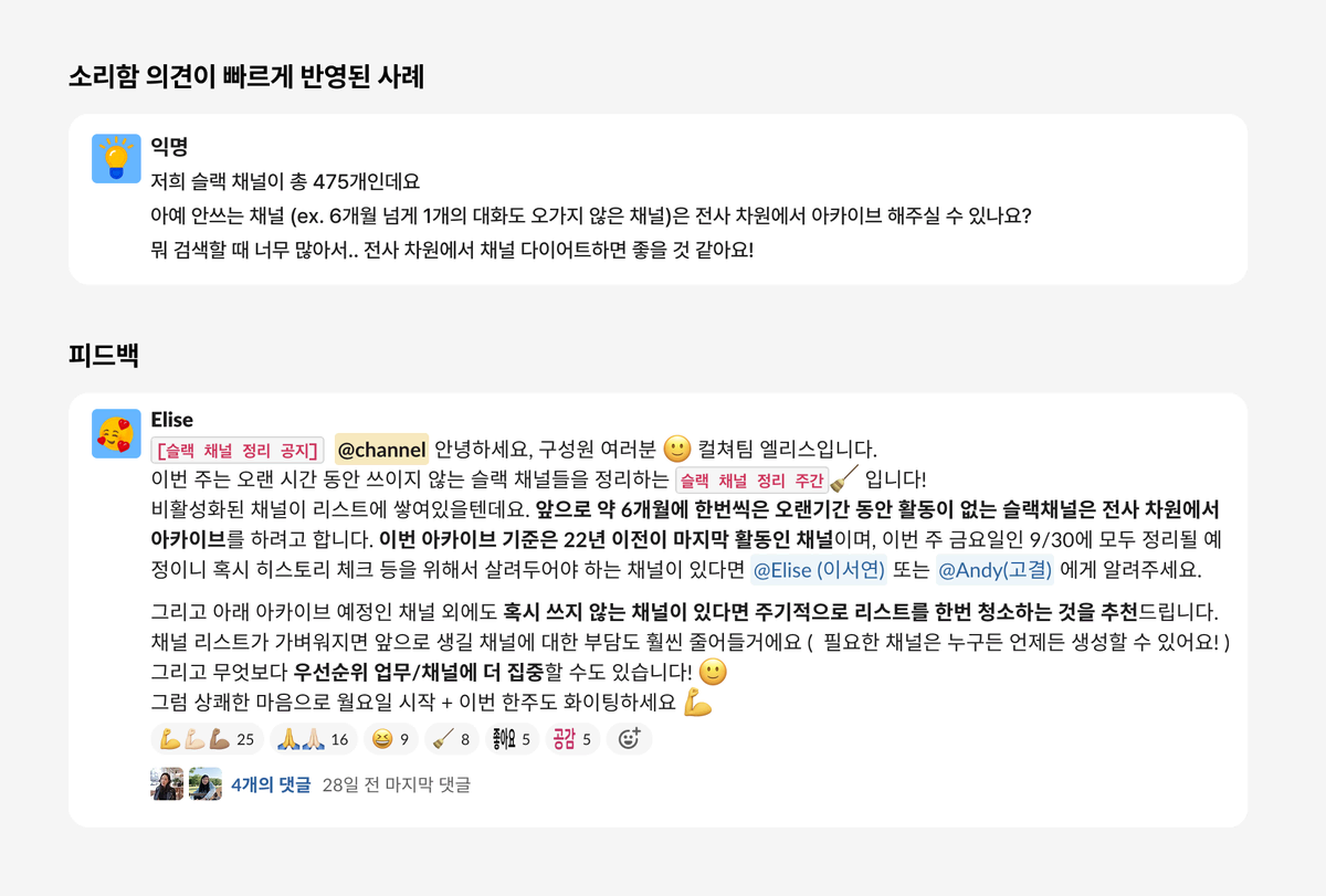 이러한 문화를 바탕으로 구성원 누구나 슬랙 채널을 통해 번개장터 서비스에 대해 의견을 제안하고 건의할 수도 있습니다.