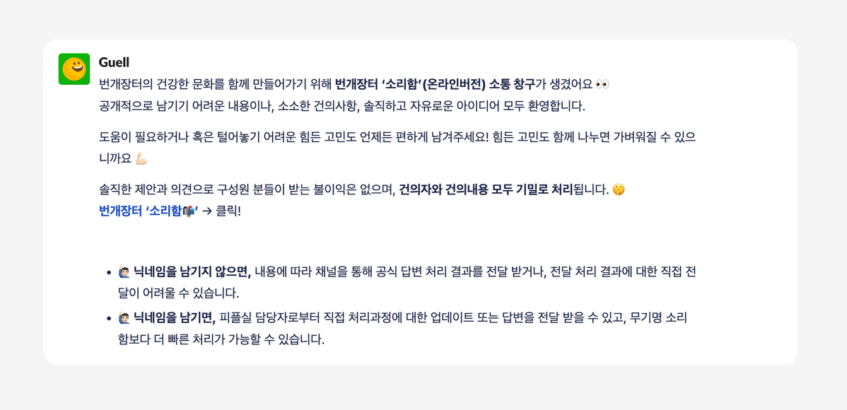 최근에는 비공개로 회사에 대한 건의사항이나 자유로운 의견을 남길 수 있는 번개장터 소리함을 만들었는데요. 기명으로 남겨주신 경우엔 적극적으로 논의 후 개별적인 답변도 드리고 있어요.