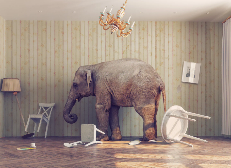💡’방 안의 코끼리’란? 모두가 잘못됐다는 걸 알면서도 먼저 말을 꺼냈다가 오히려 잘못된 결과를 초래할까 봐 아무도 이야기를 꺼내지 못하는 문제를 비유하는 표현입니다. 즉 방 안에 코끼리가 있는 상황에서도 코끼리를 보지 못한 척하며 불편함을 감수하는 것이죠.