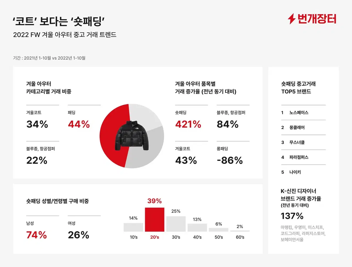 2022년 11월 21일(월) 취향 중고거래 앱 번개장터(공동대표 강승현∙최재화)가 올해 1월부터 10월까지 겨울 아우터(겨울코트, 패딩, 블루종/항공점퍼) 중고 거래 데이터를 분석한 결과, ‘패딩’이 전체 거래량의 44%를 차지하며 가장 인기가 많은 아우터로 조사됐다. 이어 ‘겨울코트’가 34%, ‘블루종/항공점퍼’가 22%를 차지했다.