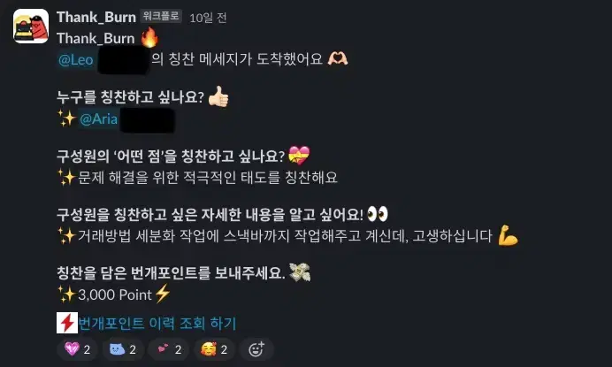 LEO: 다양한 부분들이 있겠지만.. 개인적으로는 “Thank_Burn (땡번 : 땡큐 나의 번개장터 동료들)”이라고 구성원들의 성과나 태도를 칭찬하거나 고마움을 전하고 싶을 때 슬랙 워크플로우를 이용해 이를 표현할 수 있는 제도가 있는데요, 정말 좋은 제도라고 생각해요.
