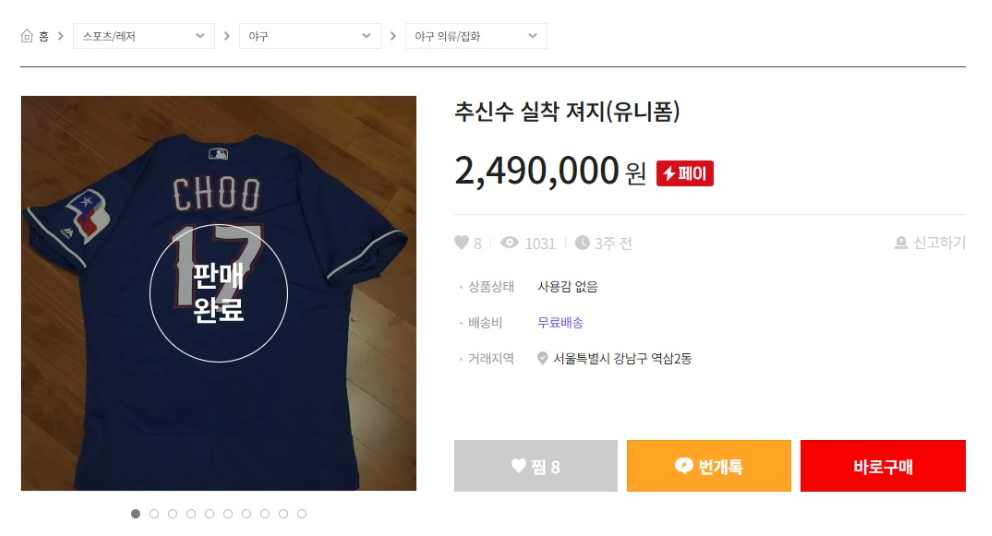 번개장터는 수요-공급 매칭이 용이한 전국구 플랫폼인 만큼, 실착이나 한정판처럼 희귀한 아이템도 활발하게 거래되고 있어요. 그 중에서도 추신수가 ‘52경기 연속 출루’ 기록을 세웠던 해인 2018년의 텍사스 레인저스 실착 유니폼은 250만 원, 지난 3월 한국에서 열린 MLB 개막전의 스타로 화제가 됐던 오타니의 2020 LA 에인절스 친필 사인 유니폼은 210만 원에 거래가 성사되기도 했죠😲