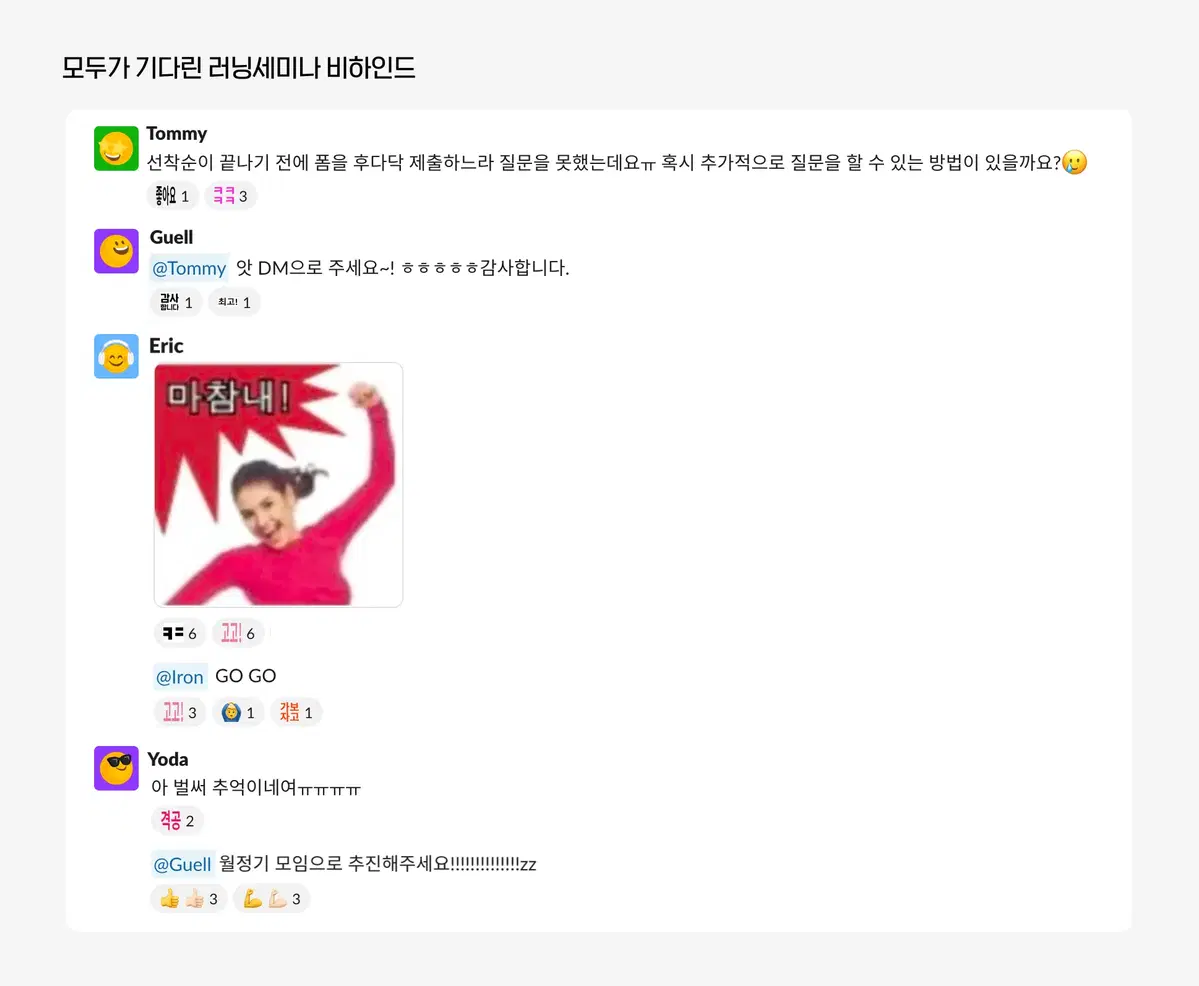 이 외에도 재미있고 다채로운 주제로 BGZT 세미나가 지속되고 있는데요. BX팀의 디자이너 Whale이 알려주는 ‘피그마 툴 사용법’, CW팀의 카피라이터 Lou의 글쓰기 팁을 담은 ‘글 써서 남주는 법’, 법무실의 ‘알아두면 쓸데 있는 생활 법률 사전’, CEO Jane의 효율적인 미팅 진행 관련 팁을 담은 '회의 퍼실리테이션 스킬' 등 각자의 직무 지식을 공유하는 세미나들이 지난해 많은 관심을 받았습니다. 가장 최근에는 컬쳐팀 Jamie가 손재주를 발휘하여 '이 세상에 하나뿐인, 핸드메이드 보석 비누 만들기'를 진행했는데, 신청자 웨이팅이 생길 만큼 사랑받는 세미나로 등극하기도 했습니다 :)