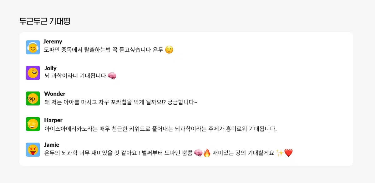 PM 그룹의 Yondu는 오랜 시간 뇌에 대한 공부를 해 온 뇌덕후이기도 한데요. 이번엔 Yondu 강사님과 함께 뇌. 알. 못도 이해하기 쉽게 정리한 ‘우리는 왜 얼어 죽어도 아아를 마실까?’ 세미나가 진행되었습니다. 추운 겨울에도 자꾸 아이스 아메리카노를 찾거나 숏츠나 릴스에 중독된 버니들에게 신경전달물질의 원리와 작용, 우리에게 주는 영향, 도파민 디톡스에 대한 이야기까지 일상적인 궁금증들을 과학적으로 풀어서 설명해 주었는데요. 뇌과학 상식을 단 1시간이라는 짧은 시간에 얻을 수 있었어요 ! 잡학 박사인 Yondu는 뇌과학뿐만 아니라 영화, 역사, 경제 등 다양한 분야에 관심이 많은 만큼 다른 흥미로운 주제로도 곧 만날 수 있을 것 같아 벌써부터 기다려집니다 !