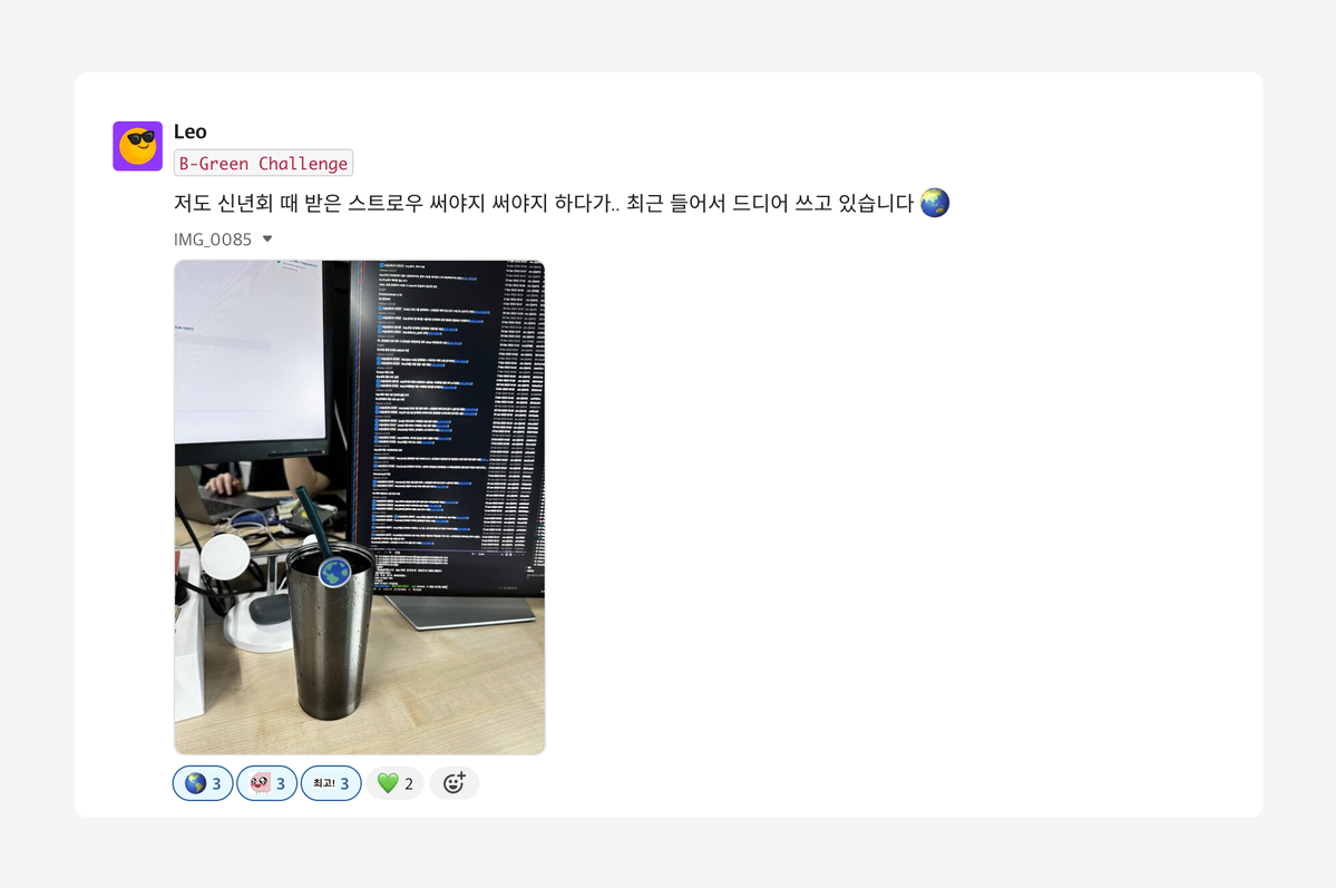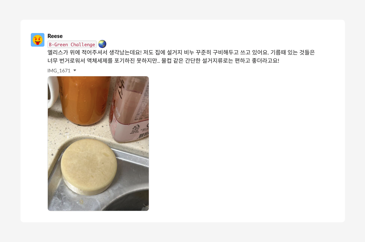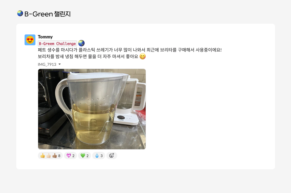 이렇게 B-Green 챌린지가 잘 진행될 수 있었던 이유는 바로 번개장터에는 환경 보호에 관심이 많은 버니들이 많기 때문이에요. 사내 커뮤니티 중 하나인 #지구방위대 이라는 슬랙 채널에서 환경 보호와 관련된 좋은 정보를 나누기도 하고, 서로의 실천을 함께 응원 하고 있습니다.