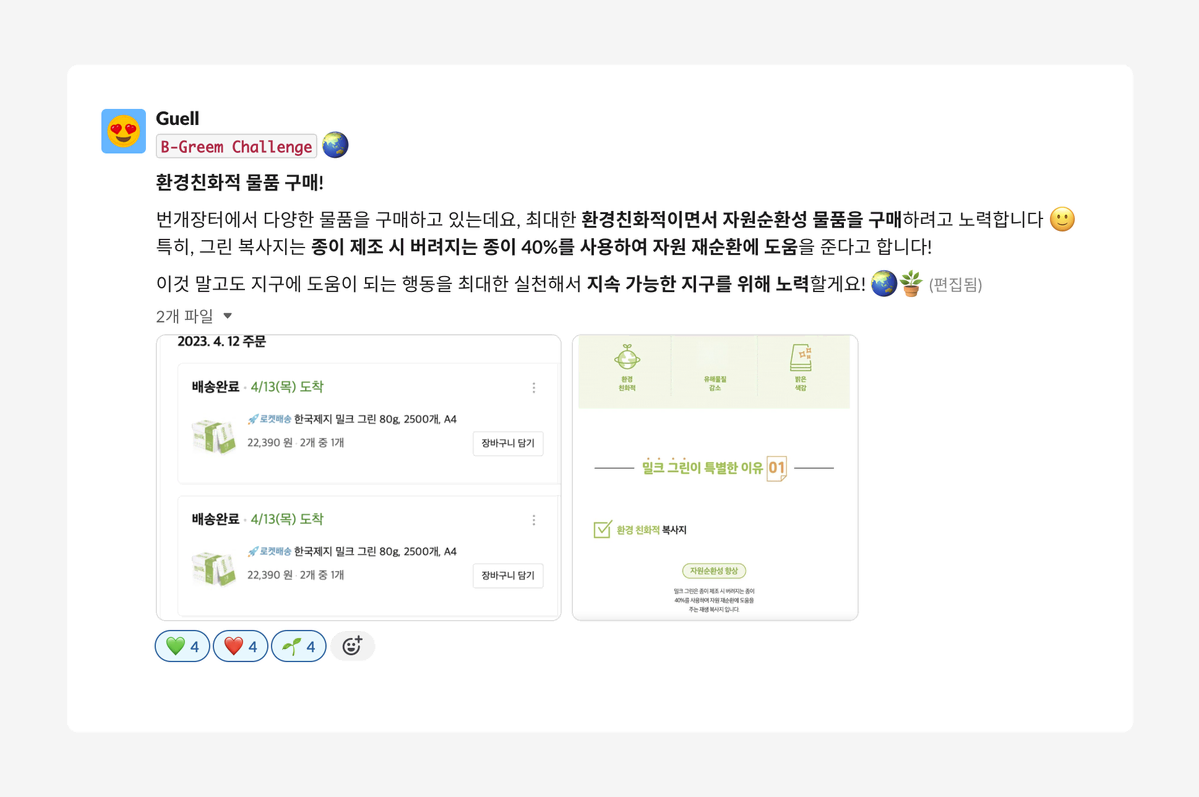 지난 23년 지구의 날에는 일상에서 지구를 지키는 행동을 직접 인증하는 B-Green Challenge Week를 진행하기도 했어요. 에너지 절약을 일상 생활에서 실천하거나 일회용 컵이나 빨때 사용 대신 다회용을 사용하는 등 많은 분들이 간단하지만 환경을 위한 행동을 서로 공유하며 챌린지에 동참해 주셨어요. 이렇게 지구를 지키기 위한 실천 팁과 노하우를 서로 공유하면서 지속 가능한 삶 그리고 소비에 대해서 생각하다 보니 챌린지가 꽤 오래 이어졌습니다.