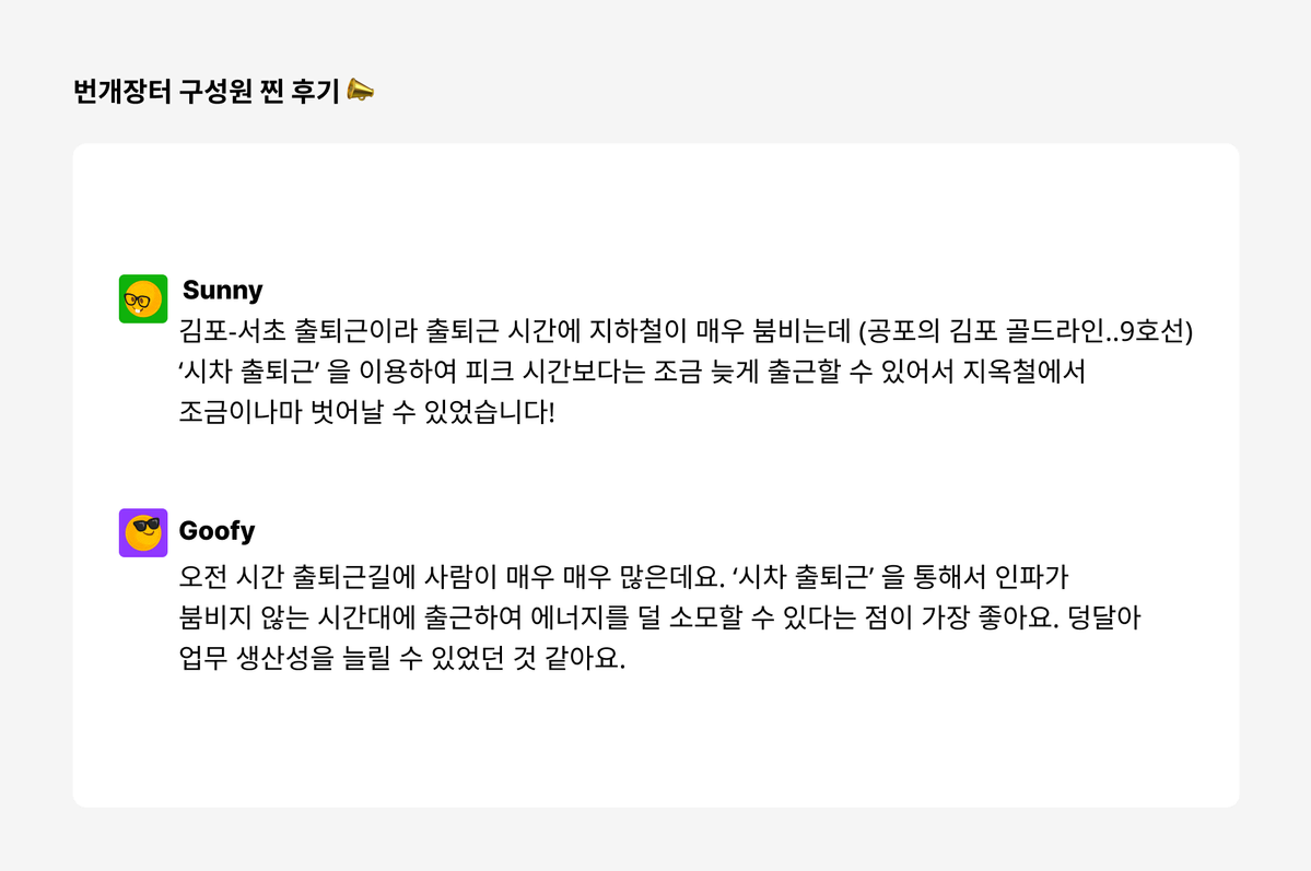 힘든 출근길을 뚫고 회사에 도착하자마자, 퇴근하고 싶다는 생각을 누구나 한 번쯤 해보셨을 텐데요. 번개장터에서는 통근 시간을 조정하여 혼잡한 출퇴근 시간을 피할 수 있고 스트레스를 크게 줄일 수 있어요. 덕분에 회사가 멀어도 정해진 시간까지 쫓기듯 출근하지 않아도 되고, 퇴근 시간도 비교적 여유로운 편이랍니다. 내가 원하는 시간에 자율적으로 출근하고, 축적한 에너지를 업무에 쓸 수 있는 큰 장점이 있어요.