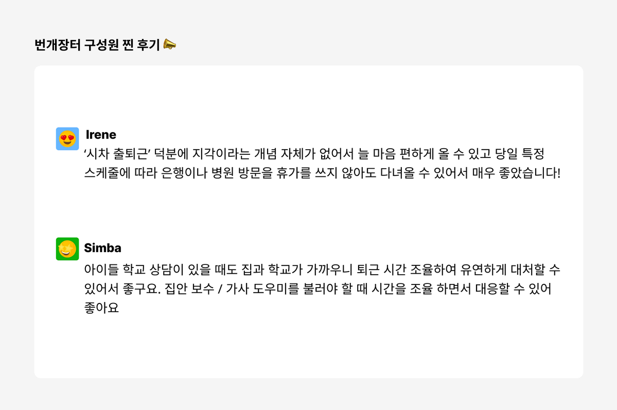 평일에만 방문해야 하는 은행이나 주민센터 혹은 예상치 못한 급한 개인 일정 등이 생겼을 때 보통 연차나 반차 등의 휴가를 사용하게 되는데요. 번개장터에서는 시차 출퇴근이나 조기퇴근 (오아시스), 하이브리드 근무를 사용하면 개인 일정을 문제없이 소화할 수 있어요. 자녀 등원과 하원을 위해 출/퇴근 시간을 조율하거나, 늦은 시간 혼자 있을 반려동물을 보살피기 위해 출/퇴근 시간을 바꿀 수 있어 구성원들의 만족도가 아주 높은 편이에요. 번개장터 구성원의 개인 시간도 일하는 시간만큼이나 의미 있고 가치 있는 시간이라고 생각해요.