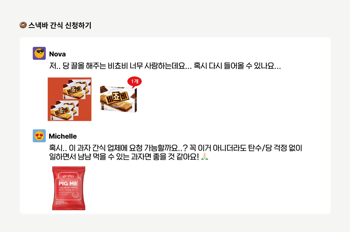 이렇게 슬랙 채널로 먹고 싶은 간식을 신청하면, 어느새 스낵바 한편에 들어온답니다. 누구나 좋아하는 국민 간식부터, 건강을 생각하는 저칼로리 간식, 시원한 음료와 신선한 유제품 등 종류가 정말 다양해요. 스낵바는 바쁜 일상 중에도 잠깐 들러서 에너지를 충전할 수 있는 최고의 쉼터죠 🍪☕