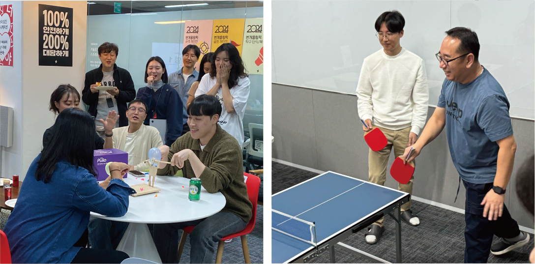 금메달 사냥을 위해 많은 후보 선수들이 업무 틈틈이 연습에 매진했다고 해요. 마음은 이미 프로 선수급 💪🏻 오피스 곳곳에 설치된 사전 연습 장소는 만남의 장이었답니다. 서로의 연습 상대가 되어주기도 하며 그동안 잘 모르던 동료와 교류하기도 했는데요. 연습 과정에서 자연스럽게 이야기를 나누며, 처음엔 서로 어색했지만 그동안 잘 몰랐던 동료들과 친해지는 소중한 시간이 되었죠.