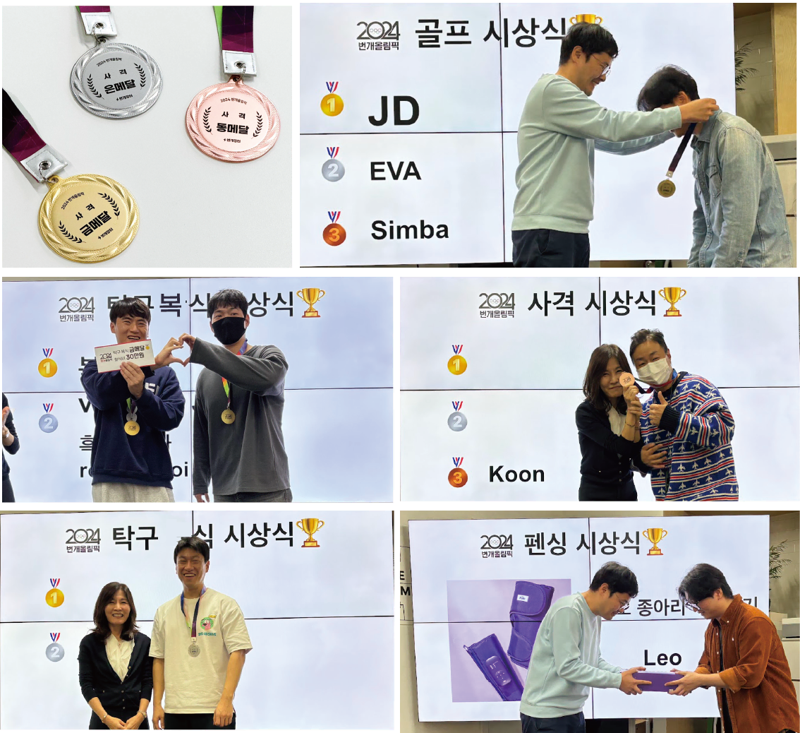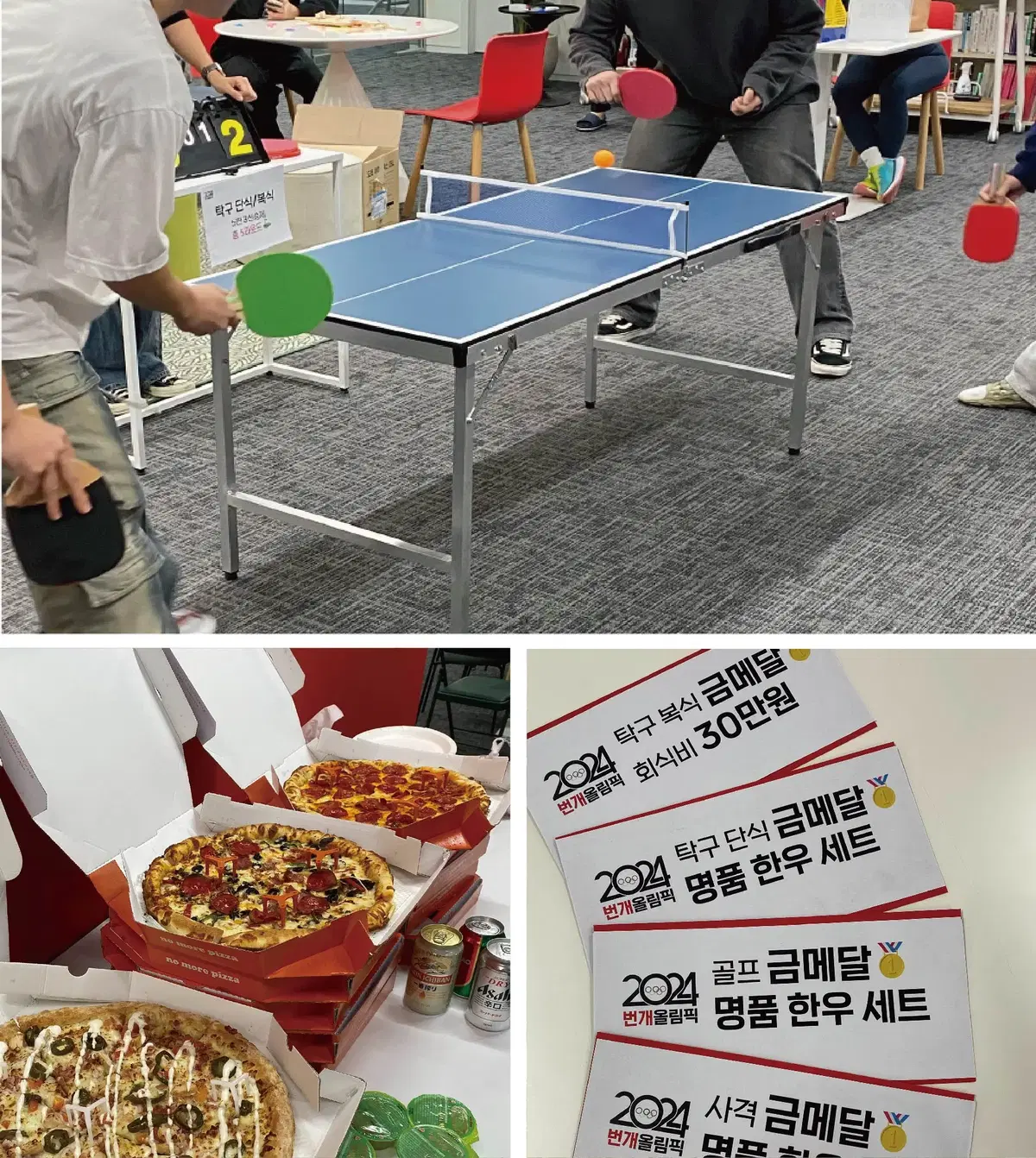 이번 번개올림픽은 메인 종목인 탁구, 골프, 사격이 채택되었는데요. 금메달과 상품을 위한 열정과 그동안 숨겨두었던 파이팅 넘치는 모습들 속에서, 서로를 응원하며 웃고 소통하는 모든 순간들로 채워져 더 특별했습니다. 특히 팀워크를 보여 줄 수 있는 단체 종목은 서로 다른 재능과 개성을 가진 동료들이 어떻게 하나로 뭉칠 수 있는지 볼 수 있는 즐거운 시간이었답니다. 메달 뿐만 아니라, 최상급 한우 세트, 회식비 등등 상품도 걸려있어 많은 구성원 분들의 승부욕을 자극하기 충분했죠 🔥