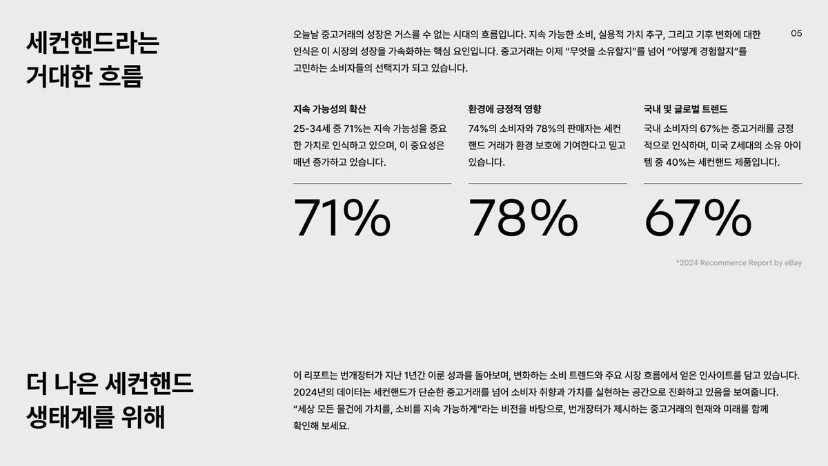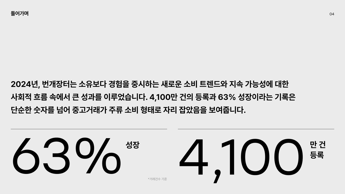 “세상 모든 물건에 가치를, 소비를 지속 가능하게”라는 비전을 바탕으로, 번개장터가 제시하는 중고거래의 현재와 미래를 함께 확인해 보세요.
