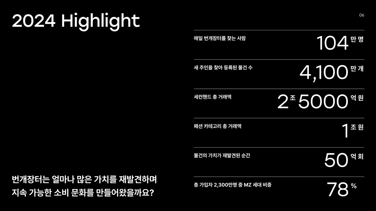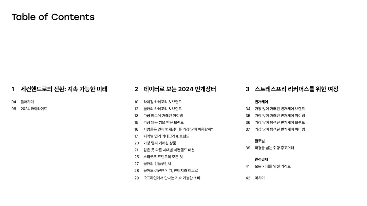 2024년, 번개장터는 소유보다 경험을 중시하는 새로운 소비 트렌드와 지속 가능성에 대한 사회적 흐름 속에서 의미 있는 성과를 이루었습니다. 이 리포트는 번개장터가 지난 1년간 이룬 성과를 돌아보며, 변화하는 소비 트렌드와 시장 흐름에서 얻은 인사이트를 담고 있습니다.