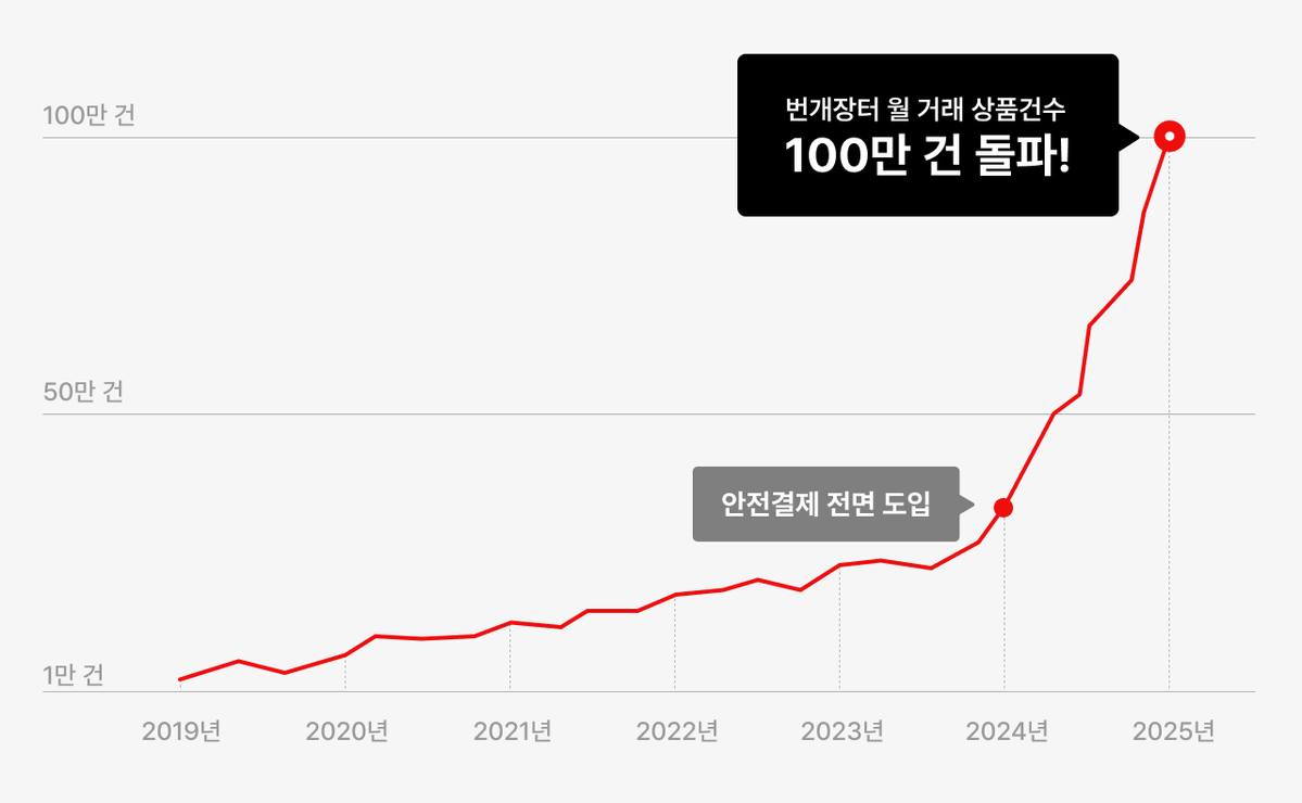 번개장터는 지난해인 24년 8월, ‘모든 거래를 안전하게’라는 슬로건을 걸고, 국내 중고 거래 플랫폼 최초로 에스크로 기반 안전결제 시스템을 전면화했다. 또한, 안전결제 전면 도입 두 달 만인 24년 10월에는 안전결제 도입으로 플랫폼 내 사기 건수 80%까지 감소했음을 발표한 바 있다.