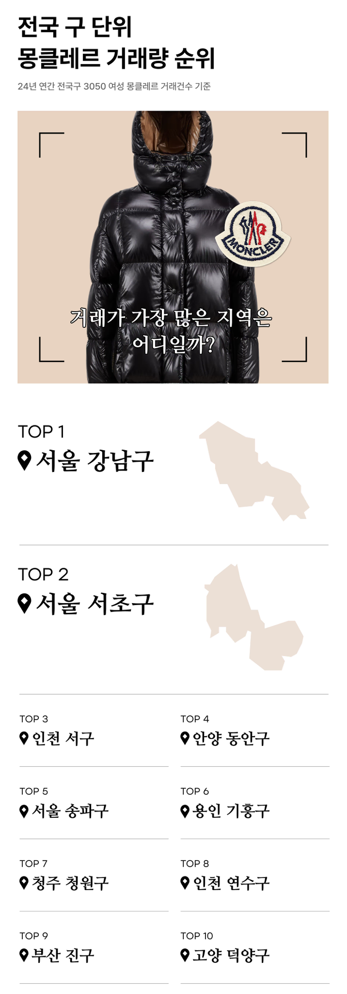 번개장터가 전국 구 단위의 30~50대 여성 몽클레르 거래 데이터를 분석한 결과, 대치동이 위치한 서울 강남구가 거래량 1위를 차지했고, 서초구가 그 뒤를 이었습니다. 강남 8학군의 핵심 지역이자 높은 학구열을 자랑하는 이 두 지역이 전국에서 몽클레르 거래가 가장 활발한 곳으로 확인되었습니다.
