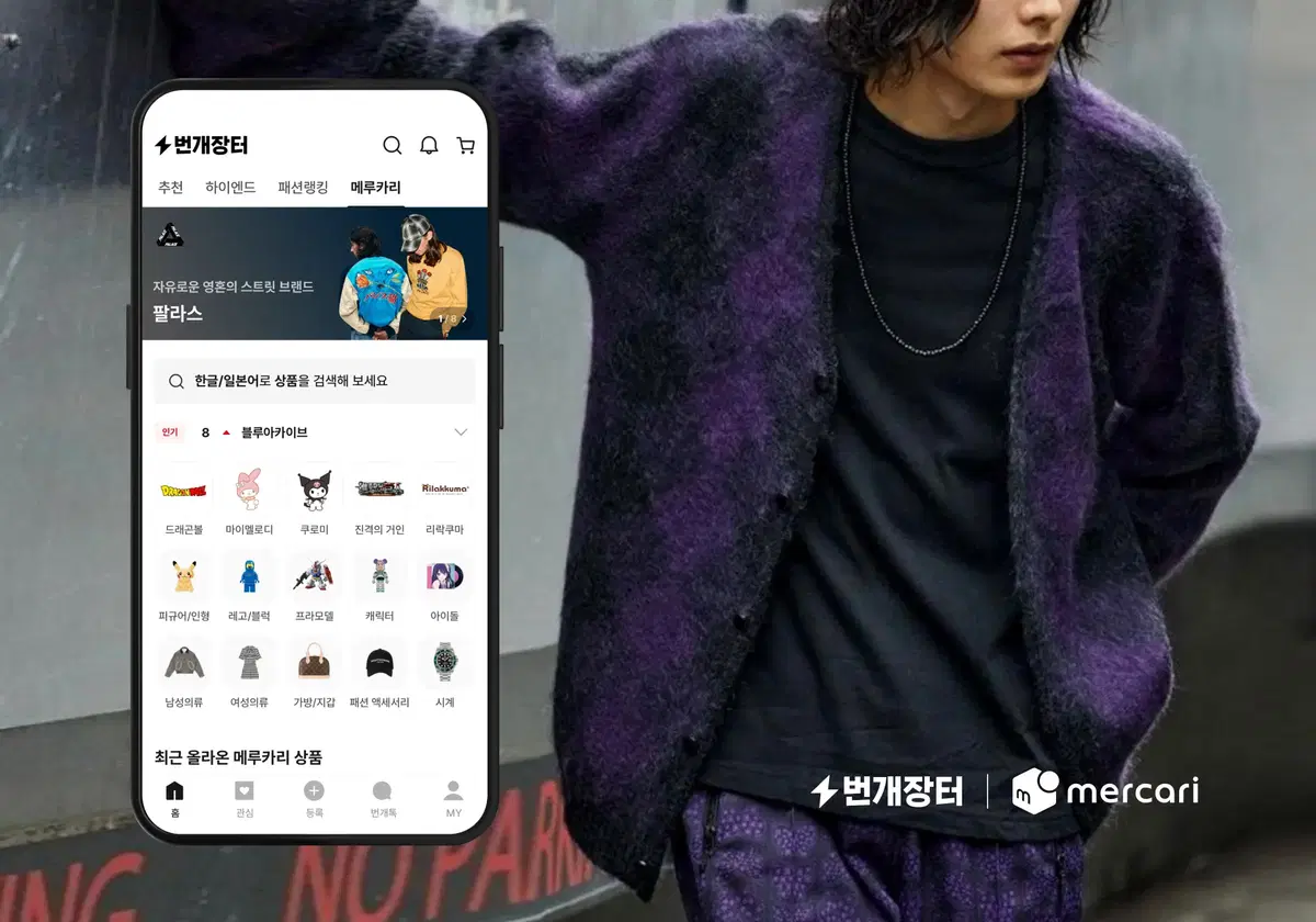 번개장터가 취향 기반 브랜드 중고거래 서비스에 힘쓰는 이유도 바로 여기에 있습니다. 2024년, 번개장터는 일본 최대 중고거래 플랫폼 ‘메루카리(Mercari)’와 단독 파트너십을 체결하고, ‘해외 탭’ 기능을 신규 론칭 했어요. 일본 현지의 중고 명품은 물론, 희소한 일본 빈티지 패션 상품까지 원클릭으로 편리하게 구매할 수 있게 했죠. 지난 4월에는 일본 대표 서브컬처 전문 상점 ‘만다라케(Mandarake)’가 국내 최초로 공식 입점하기도 했어요. 또한, 프리미엄 디자인 아트페어 ‘디파인 서울 2024’ 공식 파트너로 참여하며 국내 미술계와 함께 지속 가능한 소비 문화의 가치를 알렸죠.