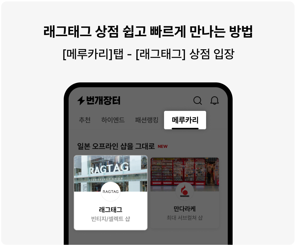 일본을 대표하는 빈티지 편집 매장 '래그태그(RAGTAG)'가 5월 30일, 번개장터에 최초 입점해요. 하이엔드부터 도쿄 로컬까지, 30년 경력 바잉 전문가들이 일본 현지에서 직접 셀렉한 브랜드 컬렉션을 만나보세요.