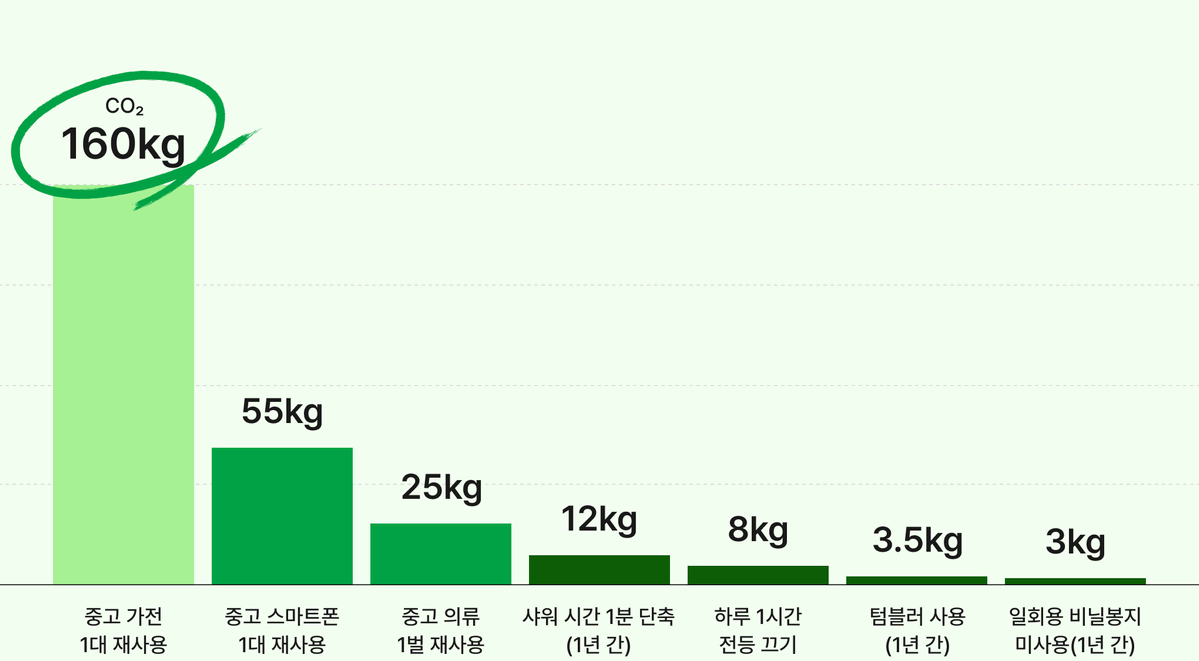 번개장터는 중고거래가 지구를 위한 좋은 습관이 될 수 있다고 믿습니다. 중고거래를 통해 의류 한 벌을 재사용하면 약 25kg, 스마트폰을 재사용하면 약 55kg의 탄소량을 절감할 수 있어요. 또 중고가전 1대를 재사용한다면 약 160kg CO₂를 절감할 수 있답니다. 1년간 일회용 컵 대신 텀블러를, 비닐봉지 대신 장바구니를 사용했을 때보다 약 25배 높은 수치죠. 번개장터는 텀블러, 장바구니를 쓰듯이 지구를 위한 습관으로 중고거래를 택하는 당신을 응원합니다. 지금, 무해한 FLEX 하고 싶은 물건을 자랑해 주세요!