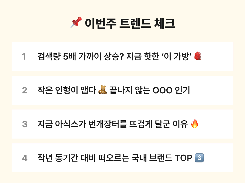 트렌드는 금세 뜨고 쉽게 사라집니다. 하지만 취향은 다르죠. 시간 속에 쌓이고, 변하며, 다시 돌아오기도 합니다. 매일 수백만 건의 거래가 이루어지는 번개장터, ‘좋아했던 것’과 ‘지금 좋아하는 것’이 수없이 교차하는 이곳에서는 취향의 흐름을 가장 선명하게 볼 수 있어요. 이번 리포트에선 지난주 급상승 키워드를 통해 지금 소비에 담긴 취향의 변화를 살펴봅니다.