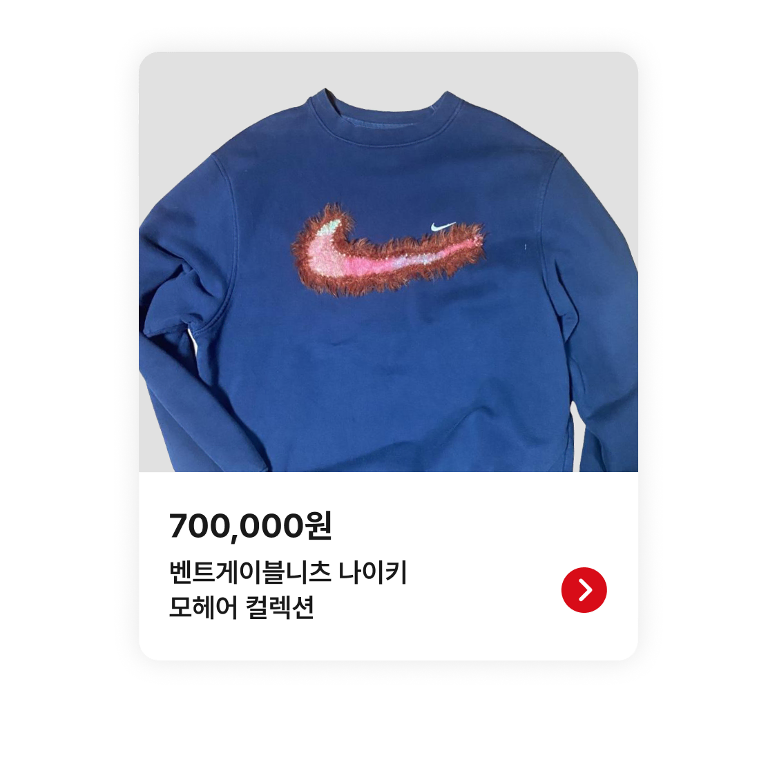 칼하트(Carhartt), 리바이스(Levis), 조던(Jordan) 등 벤트게이블니츠와 함께한 브랜드 라인업 역시 만만치 않지만, 뭐니 뭐니 해도 나이키 스웨트셔츠를 활용한 모헤어 컬렉션이야말로 팬들 사이에서 여전히 회자되는 수작이라 할 수 있다. 할머니가 기워주신 듯한 큼직한 스우시 로고와 그 윤곽을 둘러싼 포근한 모헤어, 그리고 모헤어의 모질을 관리할 수 있도록 함께 동봉된 바비 인형 패키지의 바비 브러시까지. 이런 보물이 아직까지 번개장터에 남아있다는 게 놀랍기만 하다. 벤트게이블니츠를 처음 접한 이들이라면 다소 부담스러운 가격일 수 있지만 리메이크 빈티지 마니아라면 분명 천금같은 기회일 것. 일찍 일어난 새가 벌레를 잡는다고 서둘러 찜하기 버튼을 눌러보자.