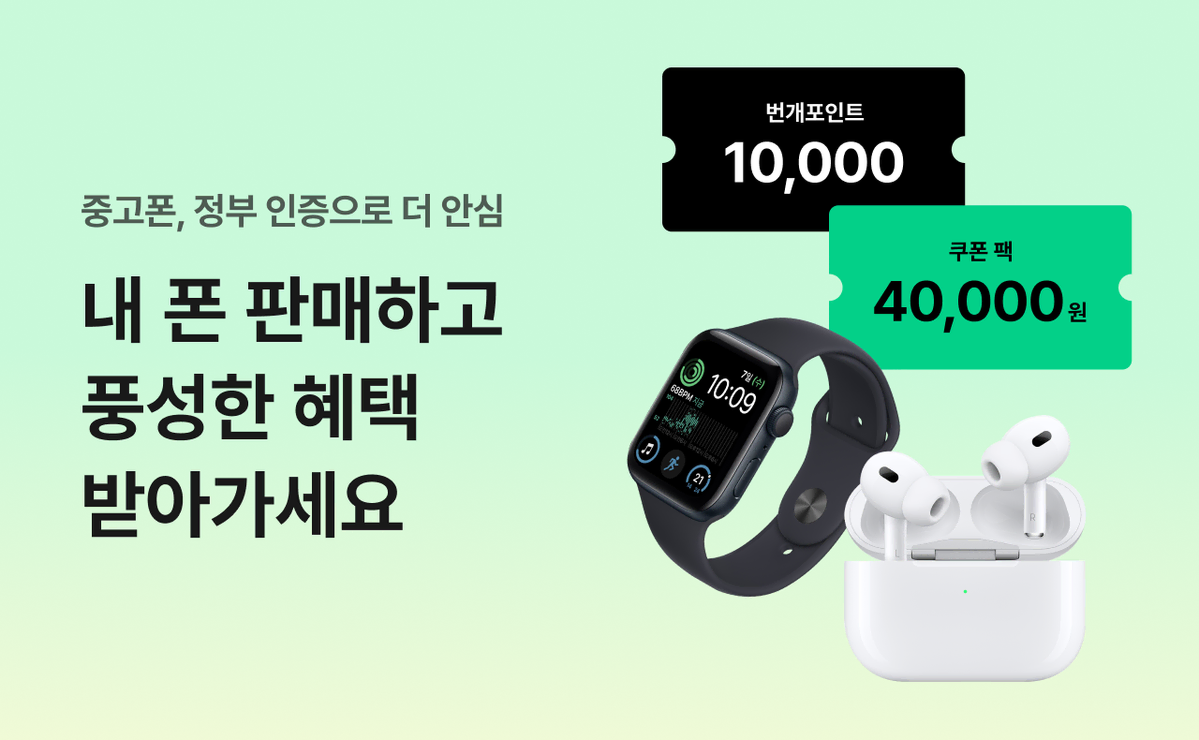 온라인 1호 안심거래 사업자 선정을 기념해, 번개장터에서 특별한 이벤트를 준비했어요. 6월 30일부터 7월 11일까지, 내 폰 견적만 확인해도 5만원 상당의 혜택을 드려요. 최종 견적 수락 후 판매 완료까지 하신 분이라면 추첨을 통해 애플워치 혹은 에어팟을 드립니다. 자세한 참여 방법은 아래서 확인해 주세요.