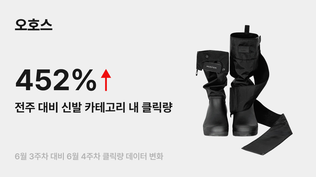 레인부츠가 해체주의 디자인을 만난다면? 테크니컬 컨셉의 액티브웨어 브랜드 ‘오호스’와 레인부츠의 대명사 ‘헌터’의 콜라보가 지난주 번개장터를 뜨겁게 달궜어요. 6월 27일 온라인 선발매 직후 ‘오호스’ 클릭량이 신발 카테고리 내에서 전주 대비 452% 증가했는데요. 특히 이번 협업은 ‘트랜스포머블’을 키워드로, 상황에 따라 실루엣이 바뀌는 디자인이 인상적입니다.