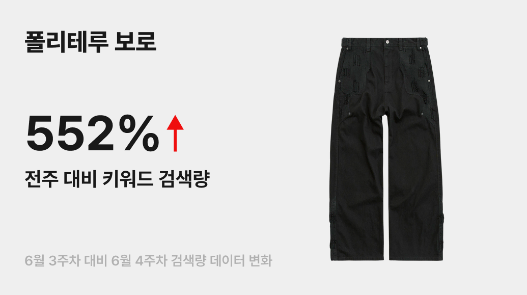 지난 6월 28일 공개된 폴리테루와 1011갤러리의 여름 콜라보 컬렉션이 공개됐어요. 그중에서도 ‘웨스턴 보로 팬츠’ 제품은 출시 직후 전 사이즈가 빠르게 품절됐는데요. 이로 인해 번개장터에서 ‘폴리테루 보로’ 키워드 검색량이 전주 대비 552% 증가하며 그 화제성을 입증했어요. 동북아시아 패션과 다양한 하위문화를 자신만의 시선으로 풀어내는 폴리테루의 감각이 이번 컬렉션에서도 확실히 드러났죠.