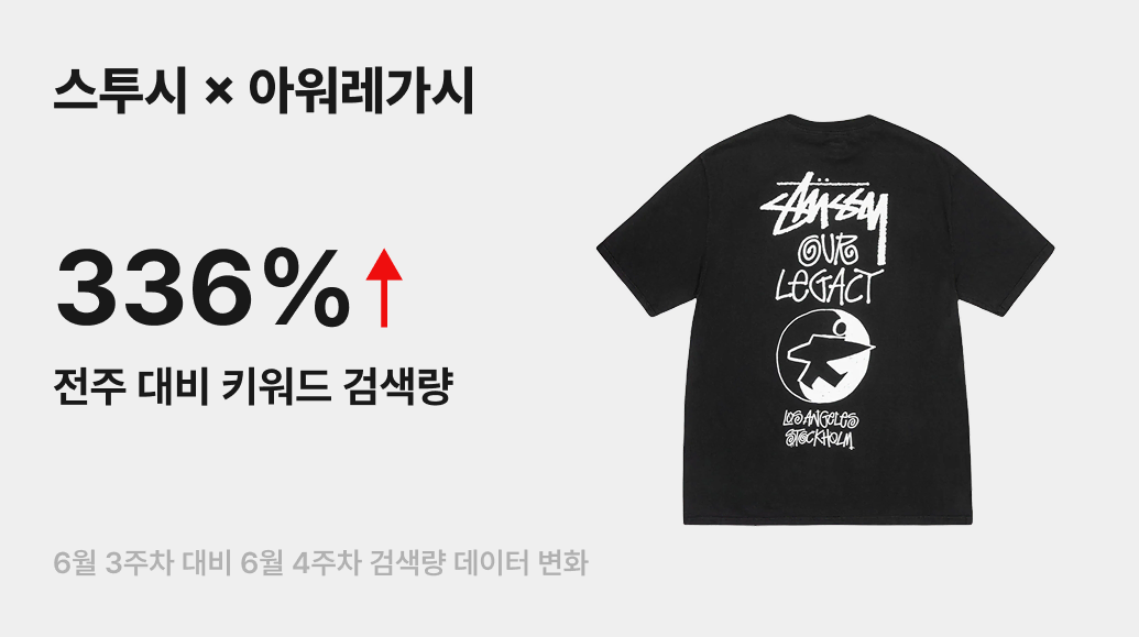 매 시즌 믿고 사는 필승 조합! 꾸준히 협업을 이어온 스투시와 아워레가시가 지난 6월 27일, 아홉 번째 콜라보 컬렉션을 공개했어요. 이를 계기로 번개장터에서 ‘스투시 아워레가시’ 키워드 검색량이 전주 대비 336% 증가했는데요. 이번 협업은 서로의 아카이브 소재를 교환하고 재해석해 만든 컬렉션으로, 스투시의 서프·스트릿 무드와 아워레가시의 미니멀 워크웨어 감성이 어우러진 점이 돋보입니다.