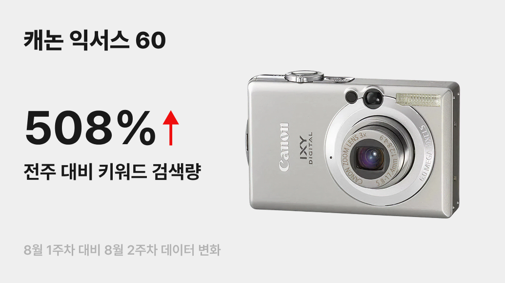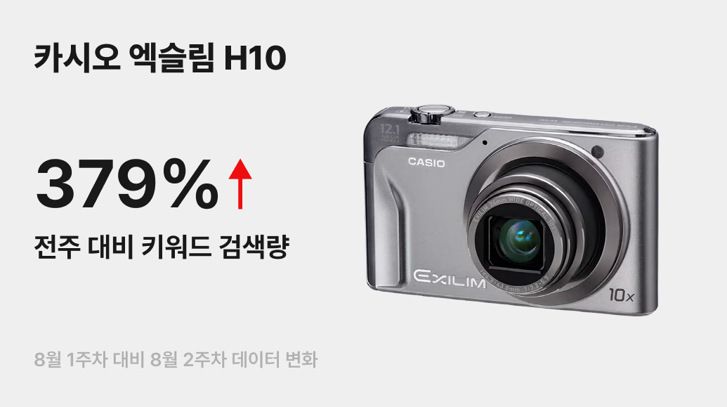 요즘 번개장터에서 오래전 단종된 제품을 찾는 발걸음이 이어지고 있어요. 스마트폰 카메라의 뛰어난 화질에 지친 사람들이 다시 과거로 눈을 돌리고 있기 때문인데요. 그 중심에는 디지털 카메라가 있습니다. 이번 주 번개장터에서 ‘캐논 익서스 60’ 검색량이 전주 대비 508%, ‘카시오 엑슬림 H10’은 379% 급증하며 다가올 트렌드를 예고했죠.