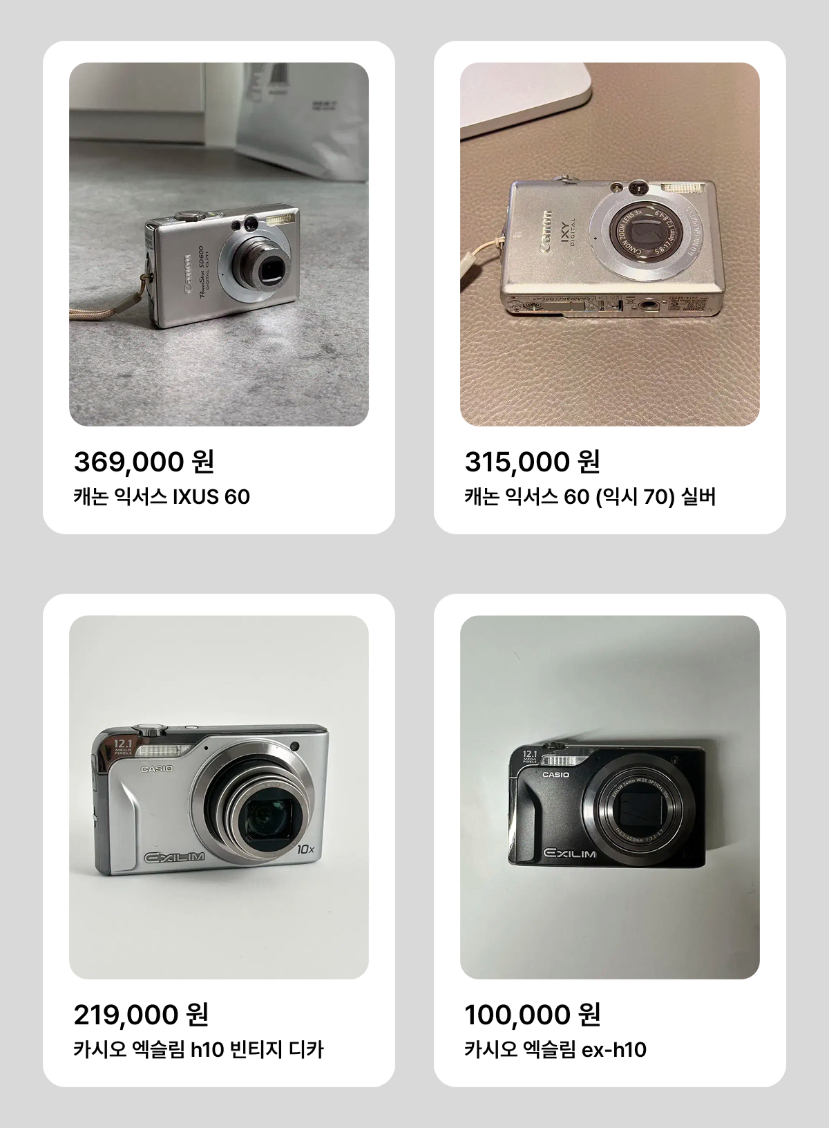 캐논 익서스 60은 따뜻하고 아련한 색감으로 마치 필름 카메라로 촬영한 듯한 분위기를 자아내요. 반면 카시오 엑슬림 H10은 당시 고화질을 구현하며 보다 선명하면서도 빈티지한 영상미를 담아내죠. 단순한 촬영 기기를 넘어, 과거의 감성과 문화를 경험하게 해주는 매개체로 재조명받고 있는 디지털 카메라! 번개장터에서 하나 장만하고 그때 그 시절로 추억 여행을 떠나보는 건 어떨까요?