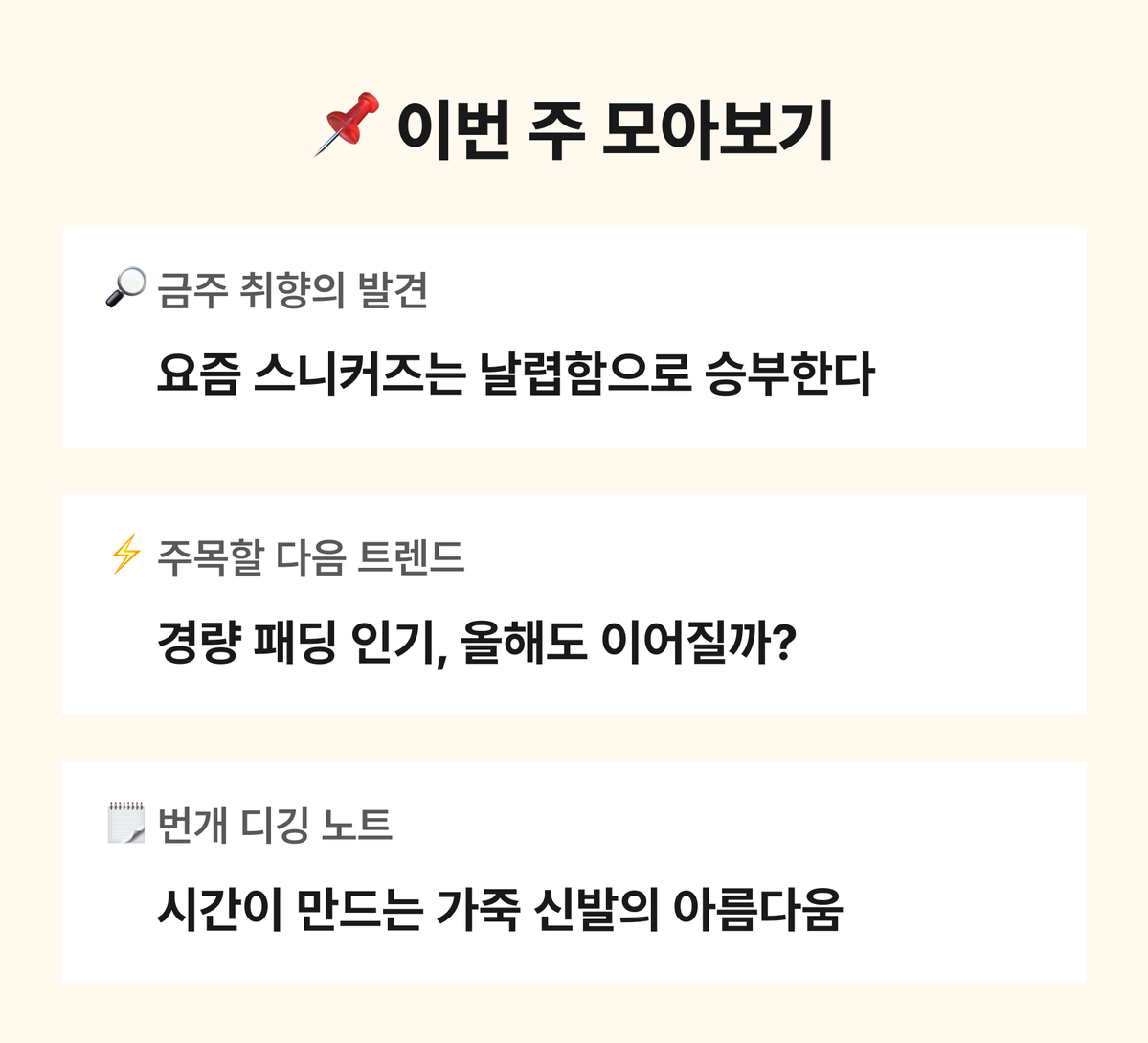 트렌드는 금세 뜨고 쉽게 사라집니다. 하지만 취향은 다르죠. 시간 속에 쌓이고, 변하며, 다시 돌아오기도 합니다. 매일 수백만 건의 거래가 이루어지는 번개장터, ‘좋아했던 것’과 ‘지금 좋아하는 것’이 수없이 교차하는 이곳에서는 취향의 흐름을 가장 선명하게 볼 수 있어요. 이번 리포트에선 지난주 급상승 키워드를 통해 지금 소비에 담긴 취향의 변화를 살펴봅니다.