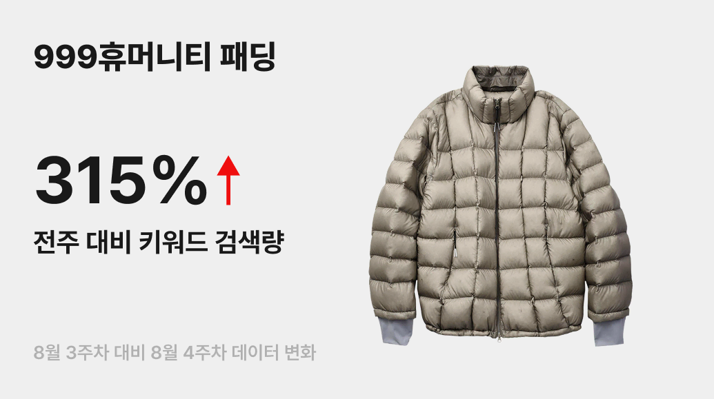 지난겨울, 패션계의 대세 아이템은 단연 ‘경량 패딩’이라 할 수 있었어요. 과연 올해도 그 인기가 계속될까요? 지난주 발매된 ‘999휴머니티(999Humanity)’의 경량 패딩이 주목받으며 지난주 대비 검색량이 315% 급증했어요.