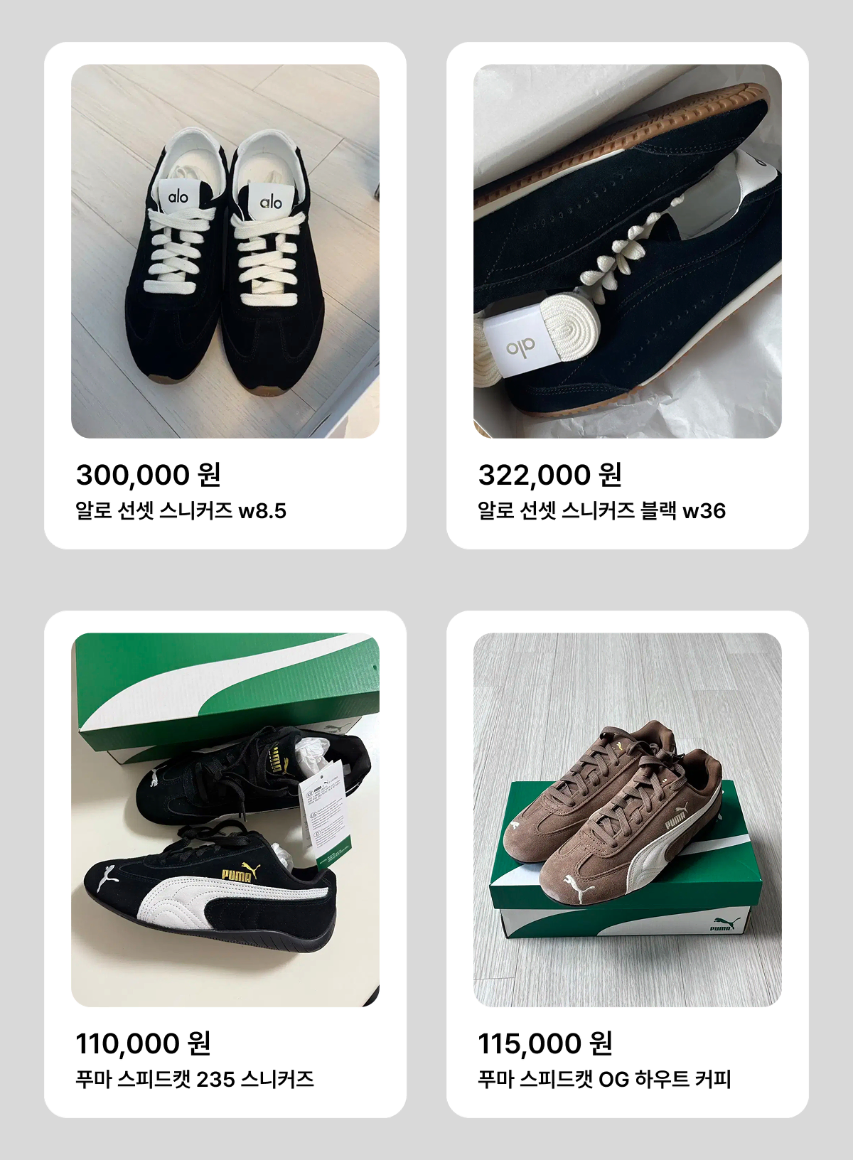 비슷한 실루엣이지만 조금 더 캐주얼한 분위기를 선호한다면, 푸마(PUMA)의 ‘스피드캣’ 제품을 추천해요. 원래 드라이빙화를 목적으로 만들어진 만큼, 얼핏 보아도 스포티한 디자인이 매력적인 스니커즈입니다. 알로보다 가격대도 합리적이라 부담 없이 구매하기 좋아요. 번개장터에서 두 모델의 매물이 다양하게 올라와 있으니, 내 취향에 딱 맞는 스니커즈를 비교하며 만나보세요.